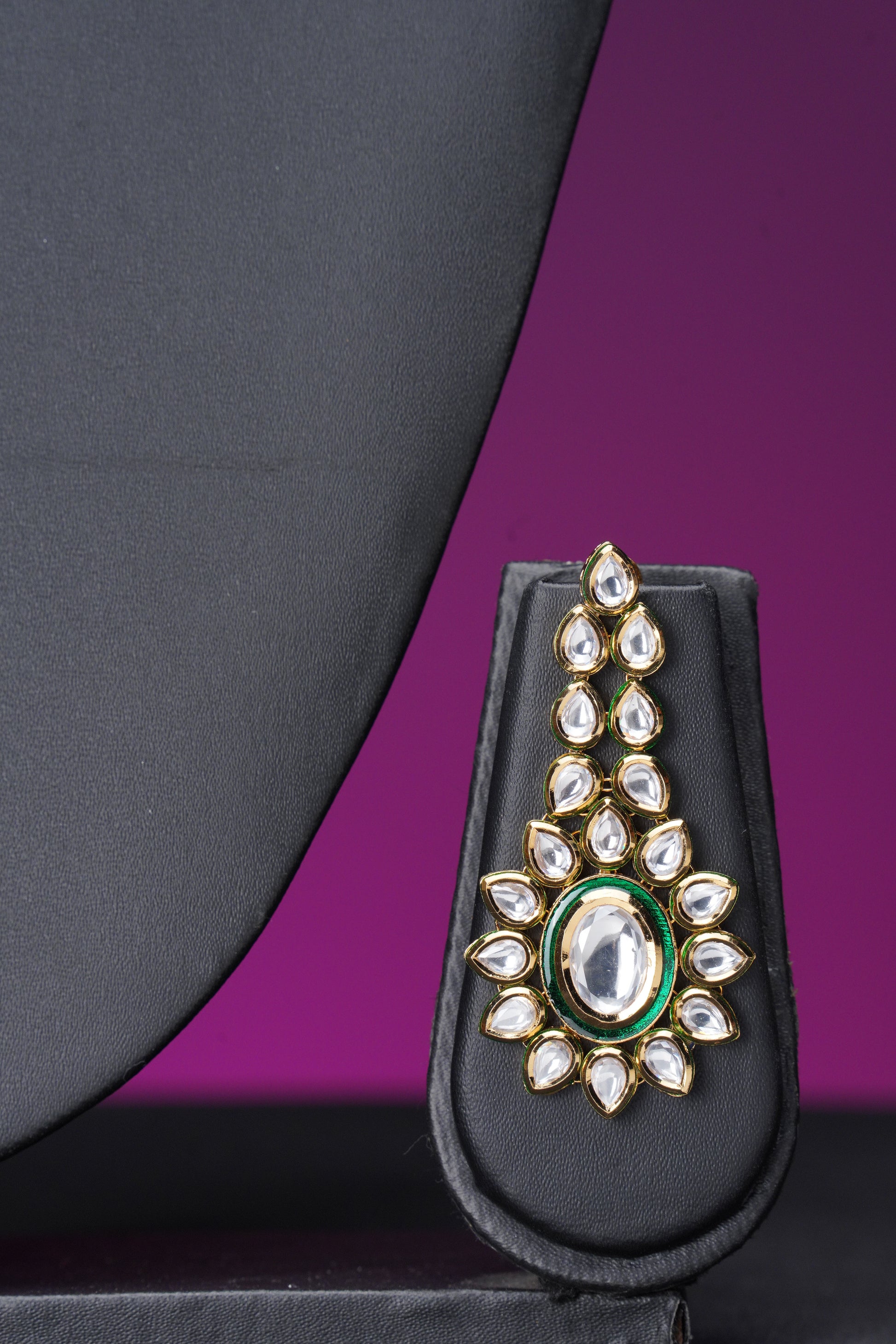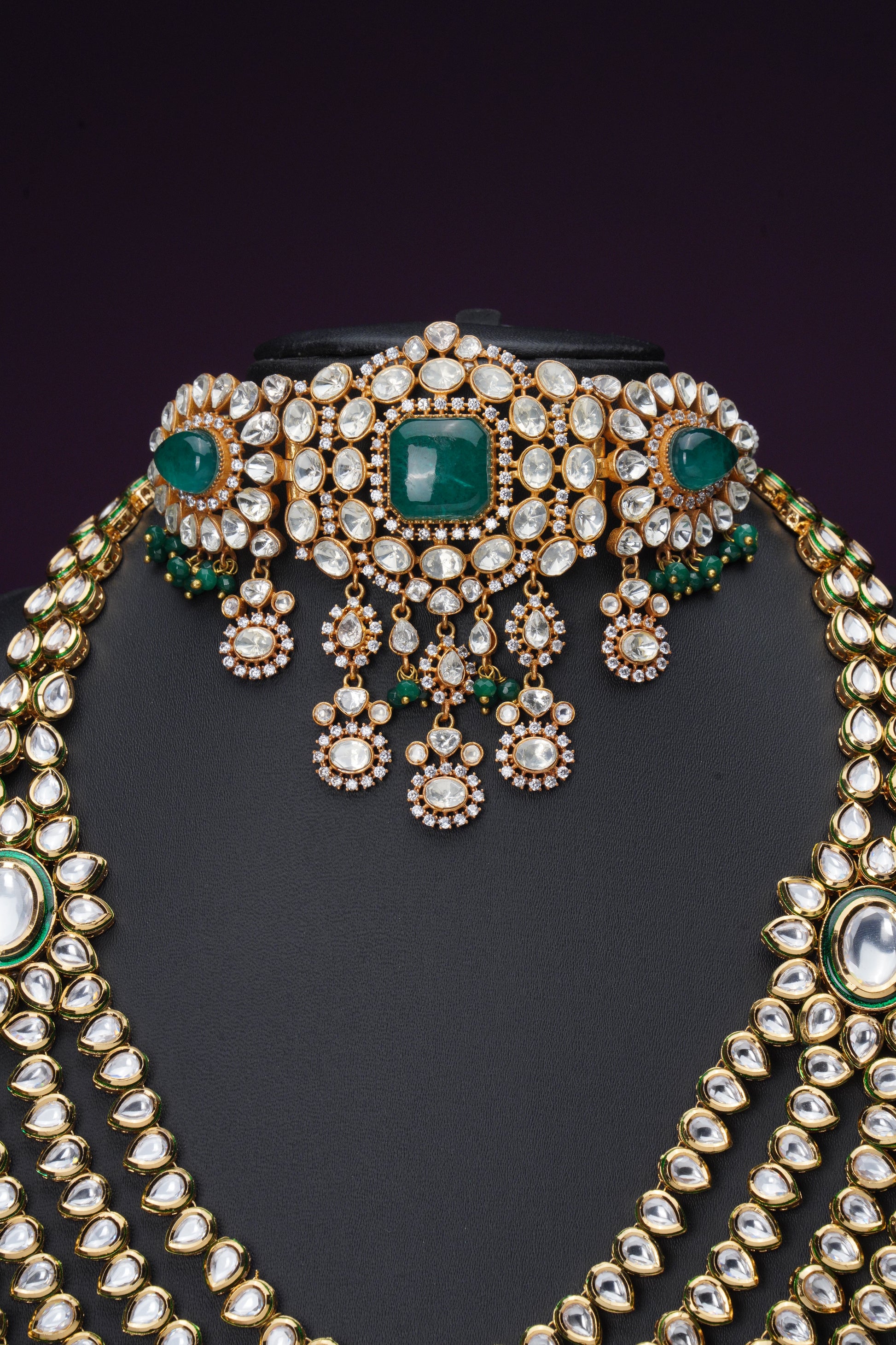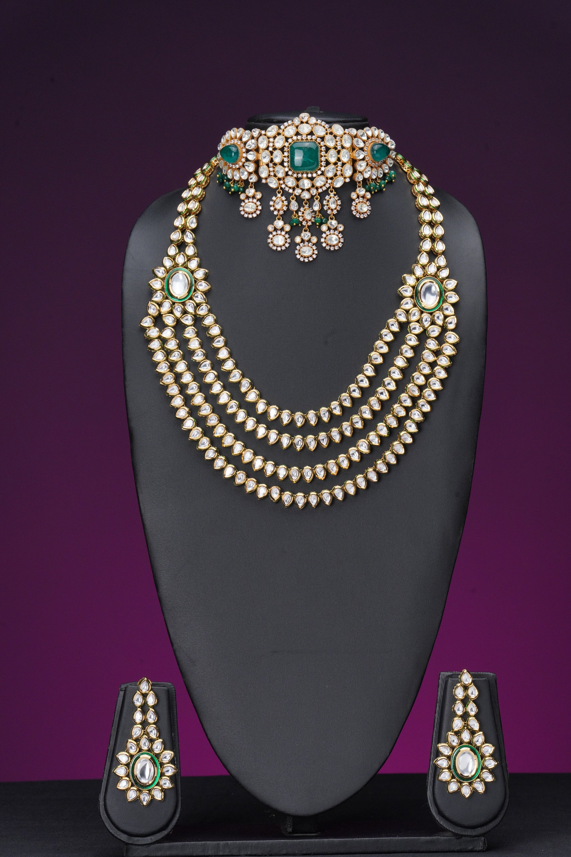 This NJCM252 necklace set features a choker and long necklace, along with earrings, accented with shimmering Moissanite polki and elegant Hara with Kundan stones. Perfect for both bridal and non-bridal occasions, the set also includes a stunning green carving stone for added charm. Elevate your style with this fusion necklace set.