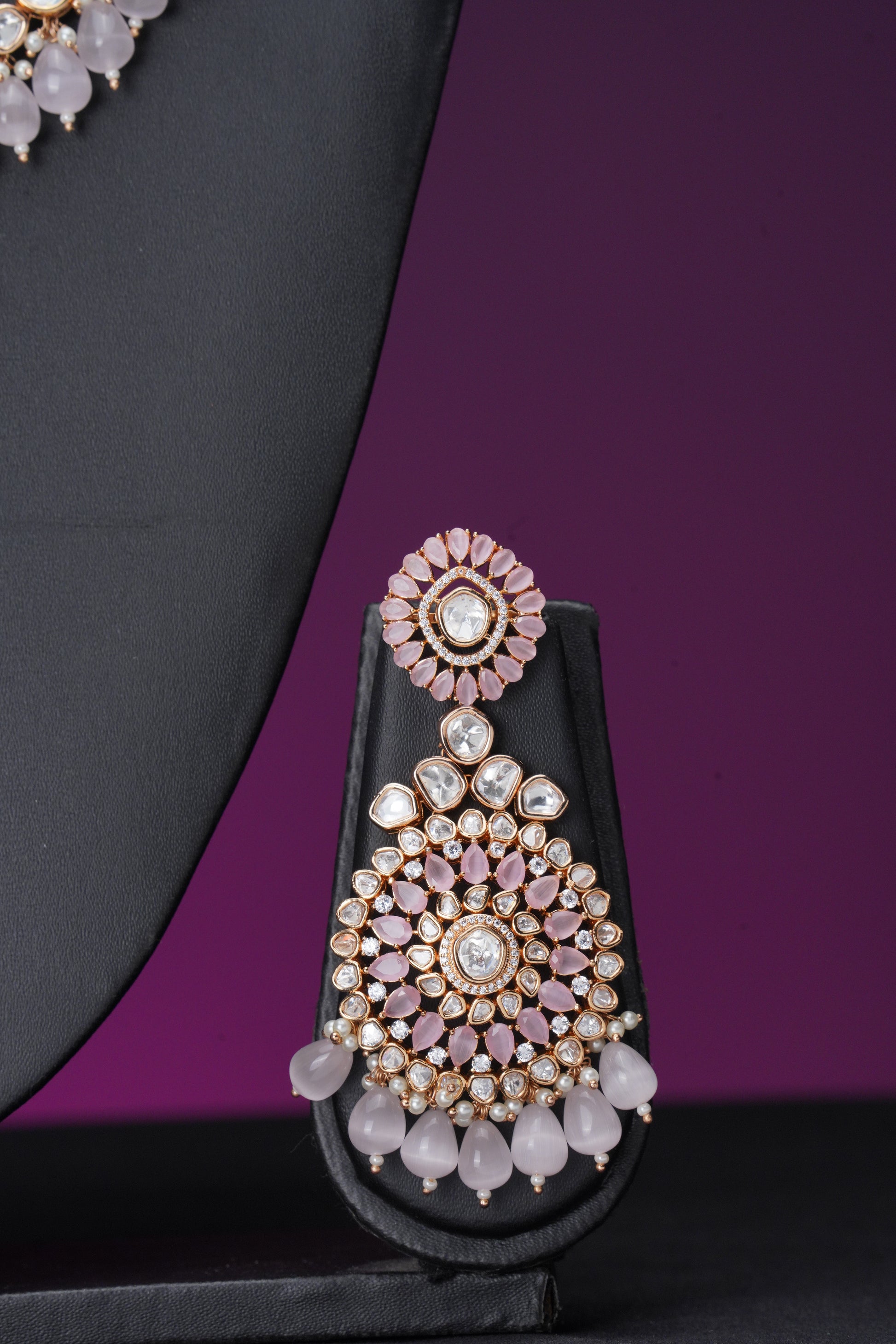 Impress with luxury and elegance with our NJCM254 layered set. This stunning set features a long floral-designed necklace adorned with pink beads and pearls, while the short necklace showcases uncut polki kundan. Complete the look with matching earrings and mangtika. Perfect for bridal and non-bridal occasions.