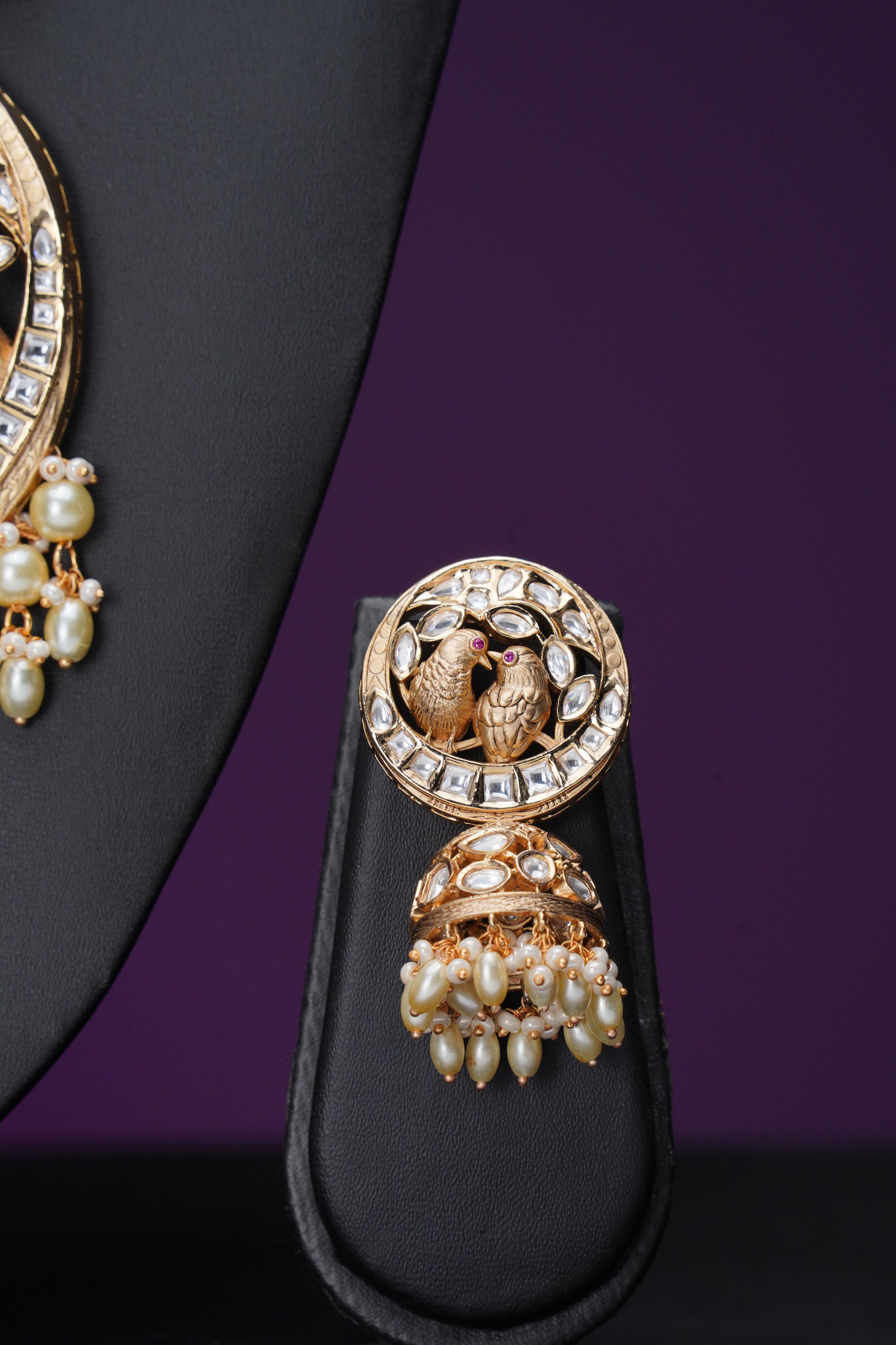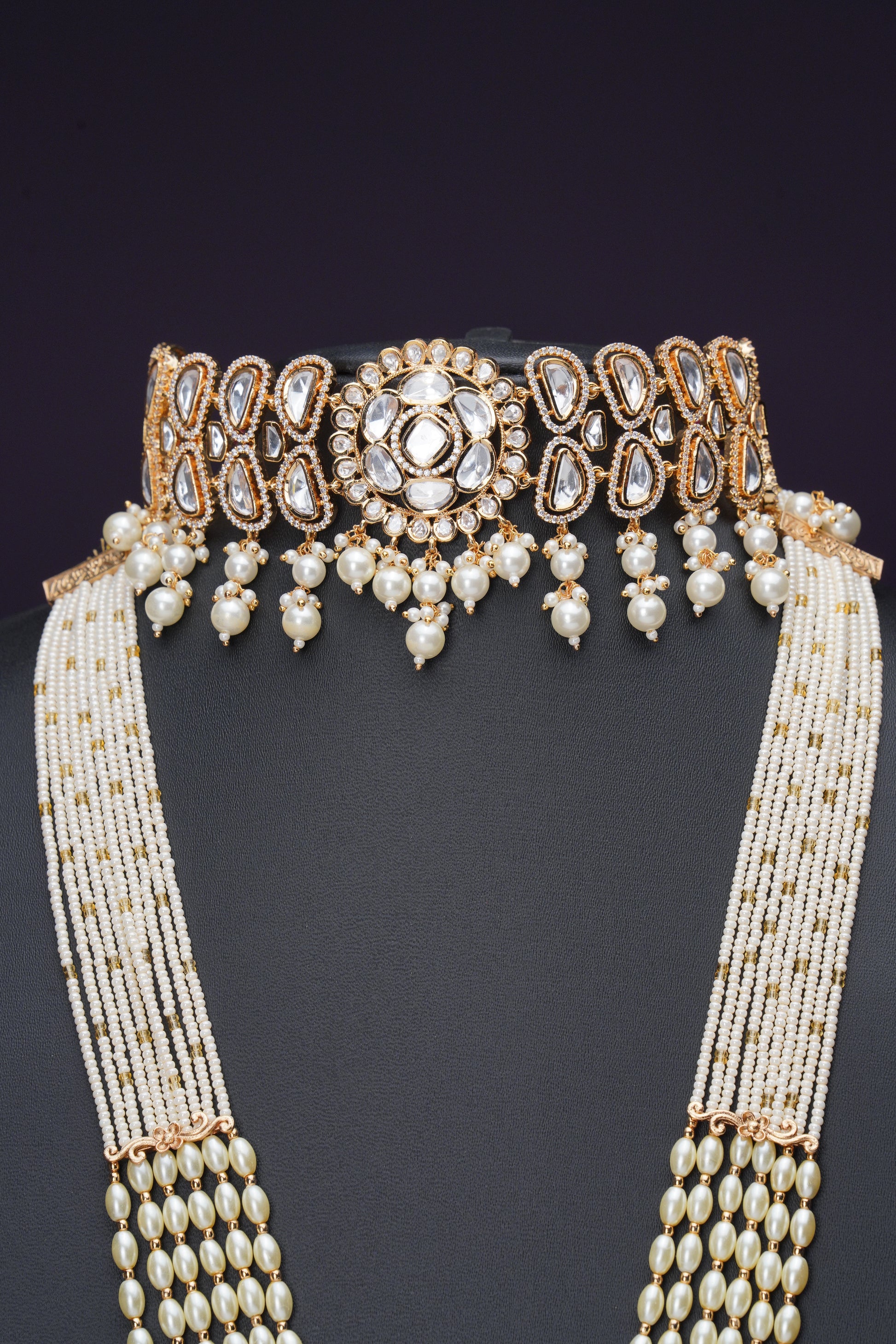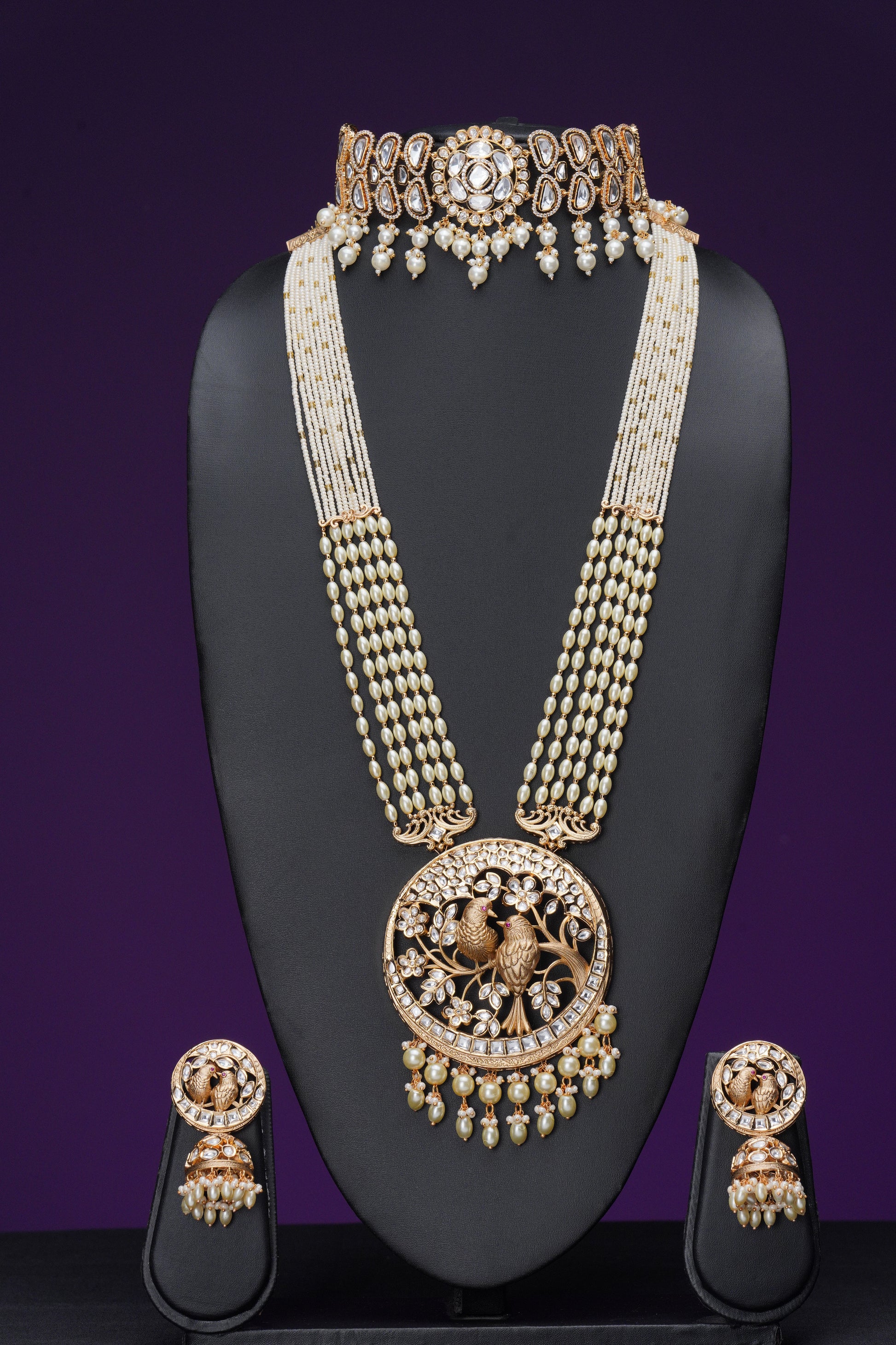 This stunning set features a stunning Moissanite Polki Long Necklace with elegant pearls, paired with an Uncut Polki Choker and dashing earrings. The intricate design includes a Twin Bird centerpiece, perfect for both bridal and non-bridal occasions. Elevate your style with this unique layered set.