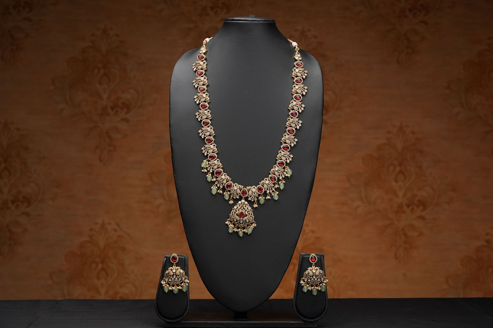 This Victorian Kundan Necklace set features an elegant double peacock design adorned with Kundan and red stones. Perfect for both bridal and non-bridal occasions, this necklace and earring set adds a touch of sophistication to any outfit. Its long length ensures a timeless and versatile look.