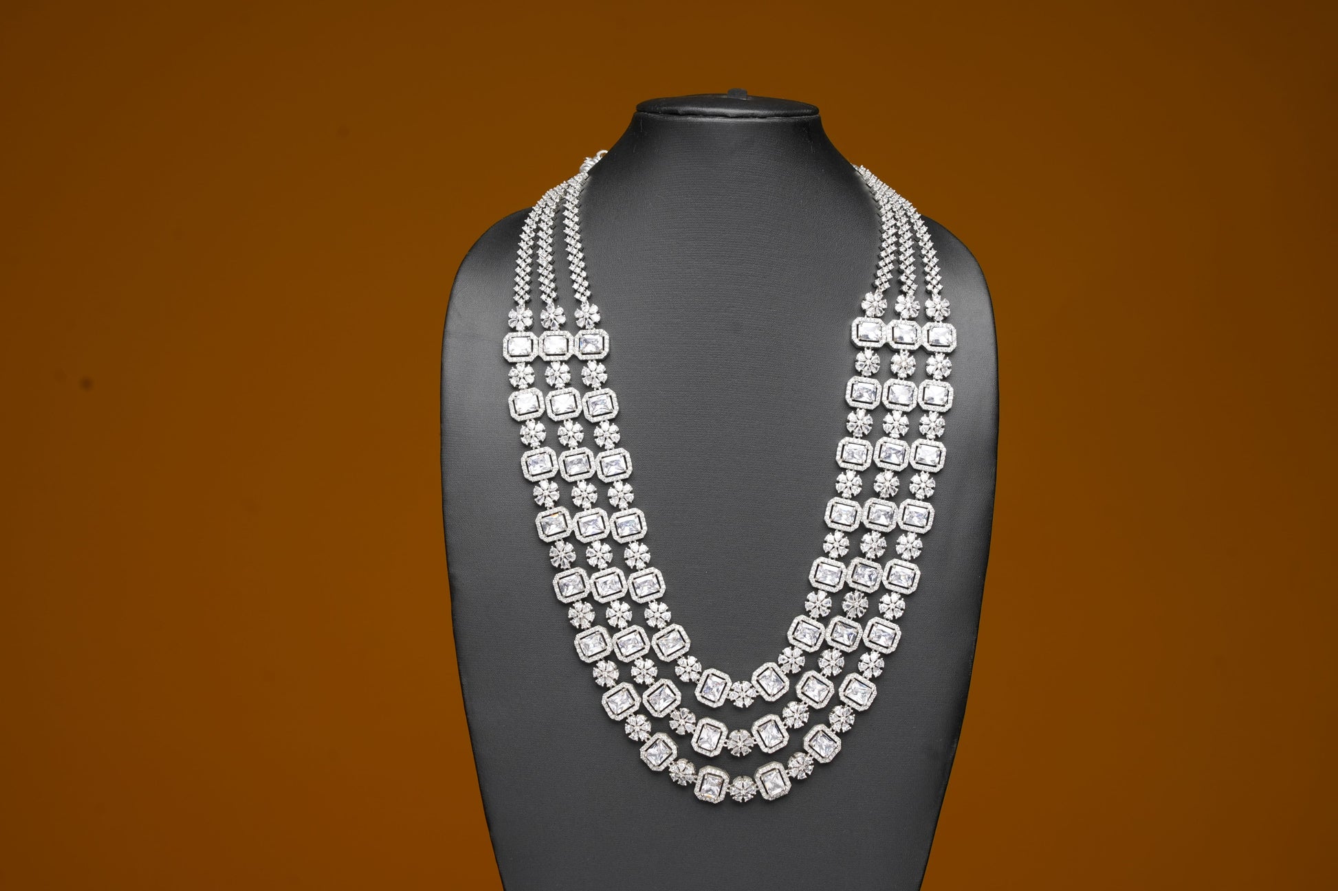 This cubic zircon necklace offers a three layer design for added elegance and shine. The delicate cubic zircon stones provide for a sophisticated look, perfect for both bridal and non-bridal occasions. Complete the set with matching earrings for a stunning and timeless pairing.