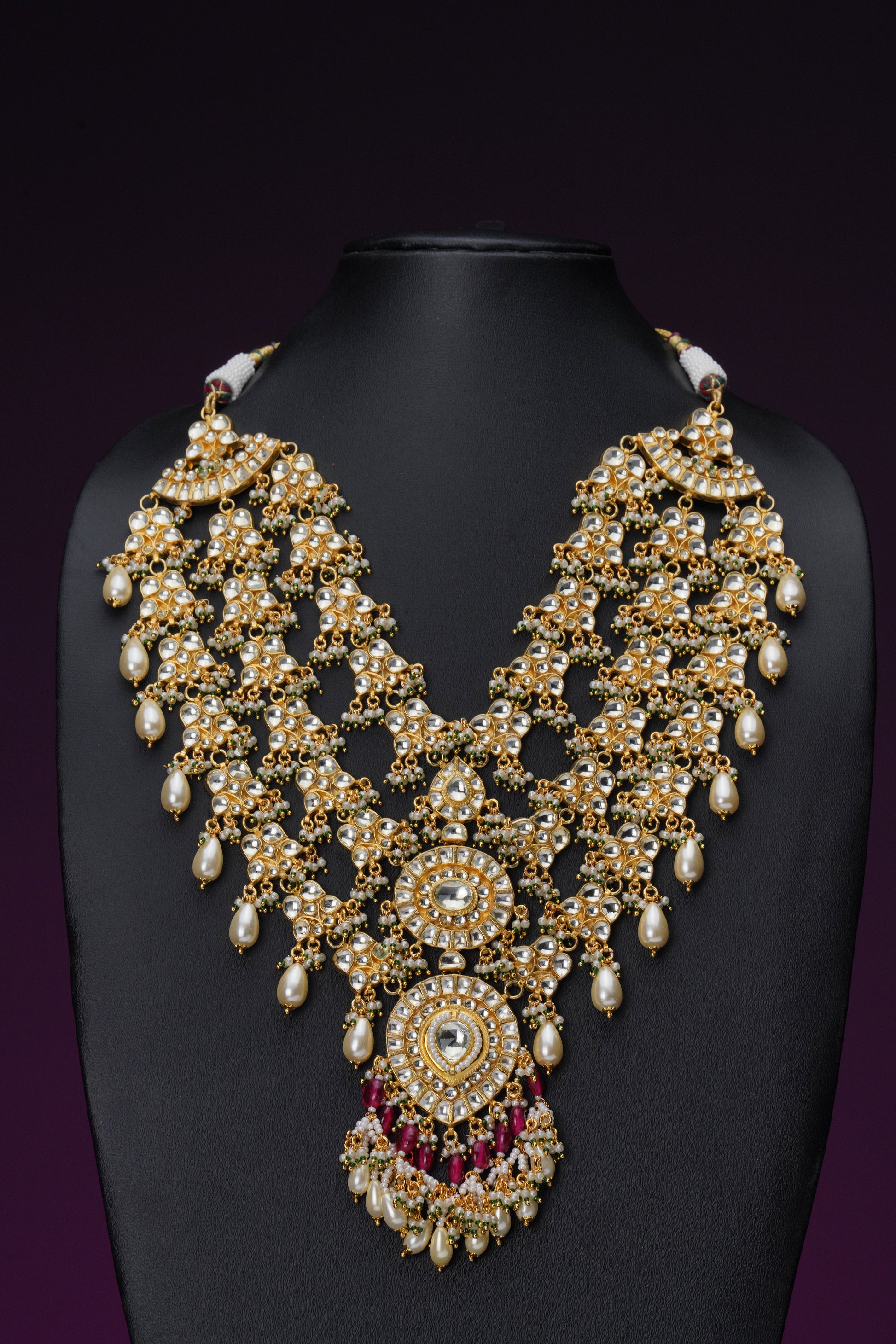 Enhance your bridal look with our Layered Pachi Kundan Necklace set. The stunning red pearls and intricate Pachi Kundan work will add a touch of luxury to your outfit. This beautiful necklace features a three layered design for maximum impact.