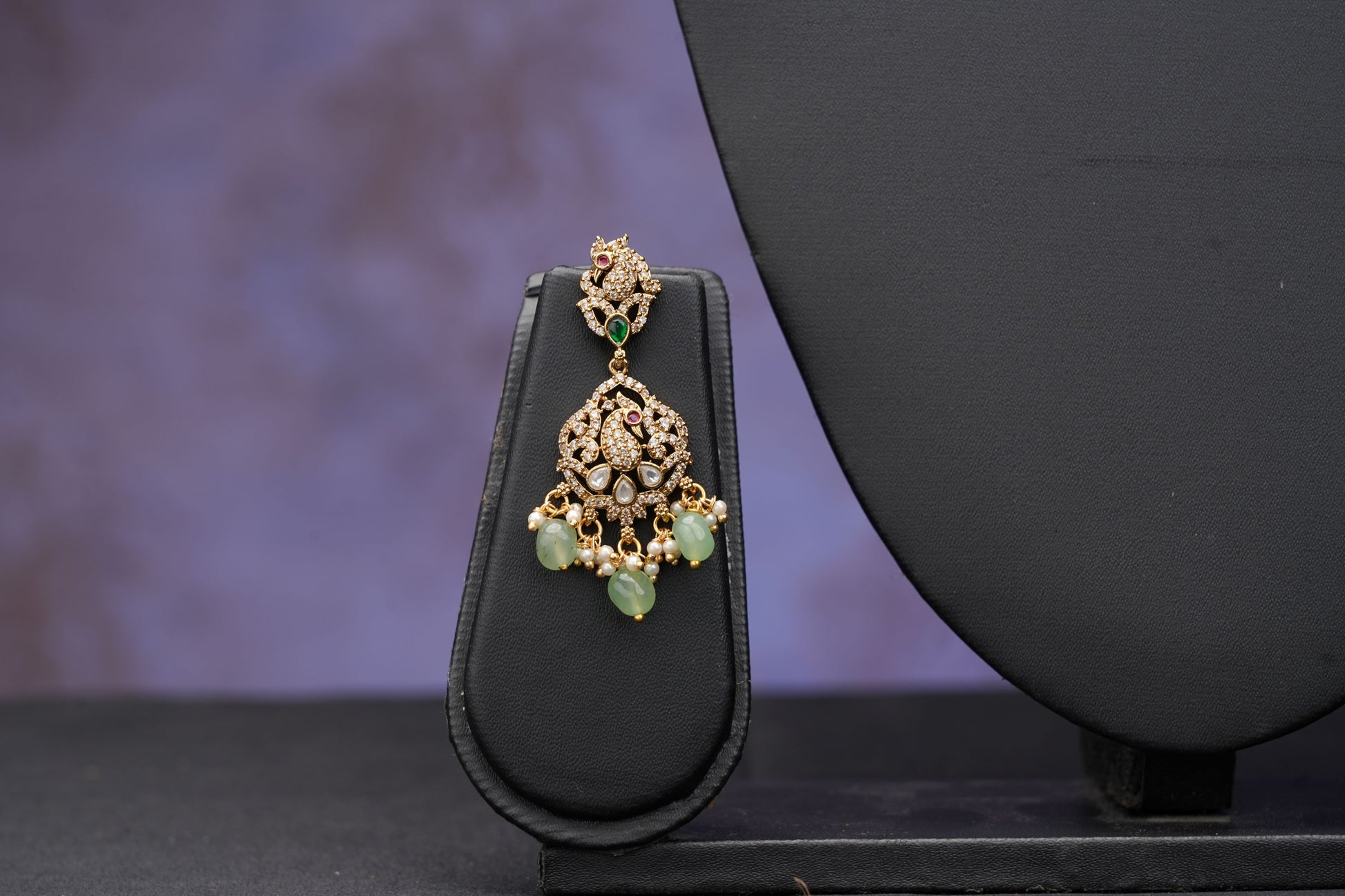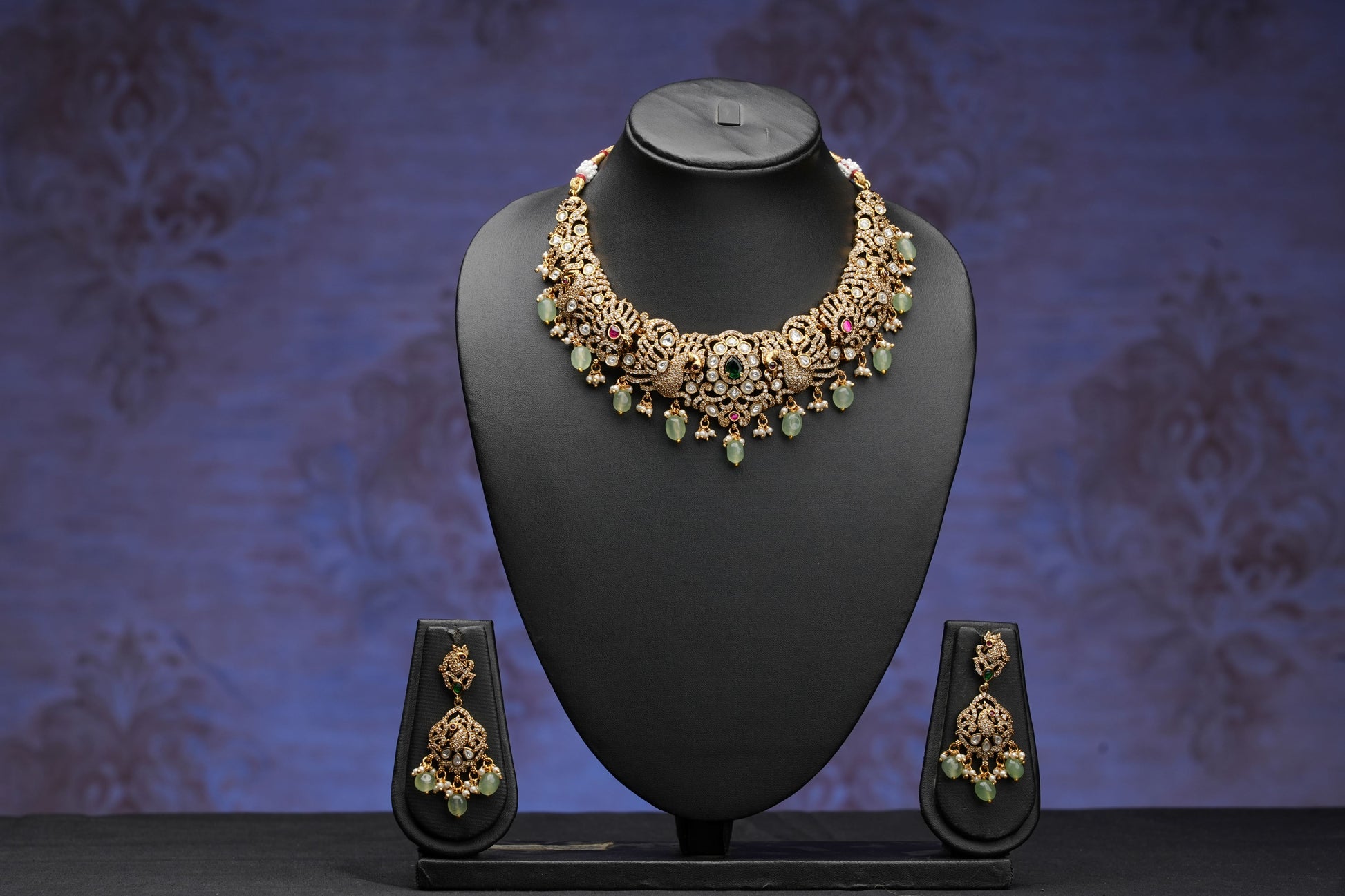 This Victorian style temple necklace set combines a classic Victorian design with intricate Jadau Kundan detailing and delicate pastel beads. The short necklace and coordinating earrings make it ideal for both bridal and non-bridal occasions. Elevate your jewelry collection with this elegant and timeless piece.