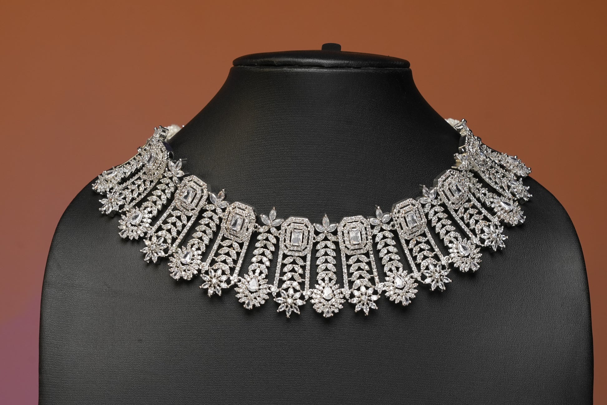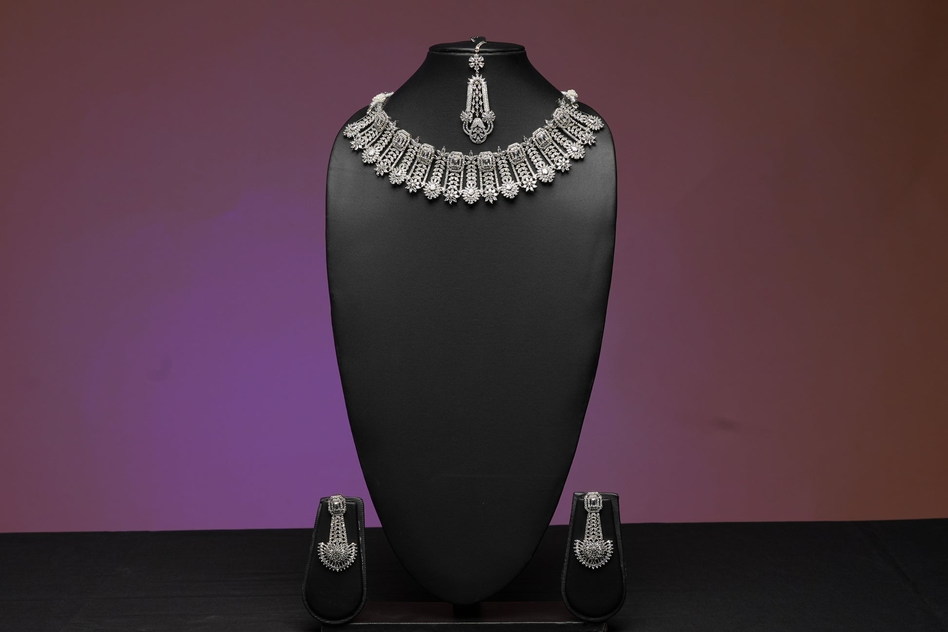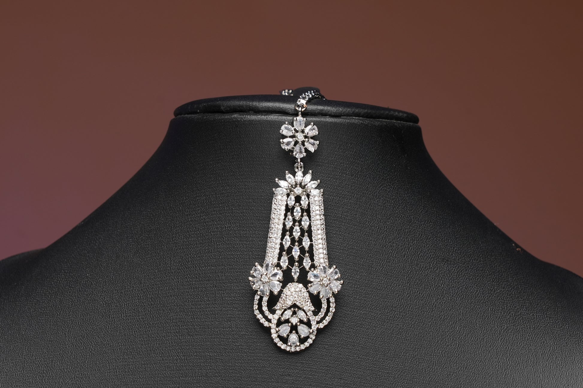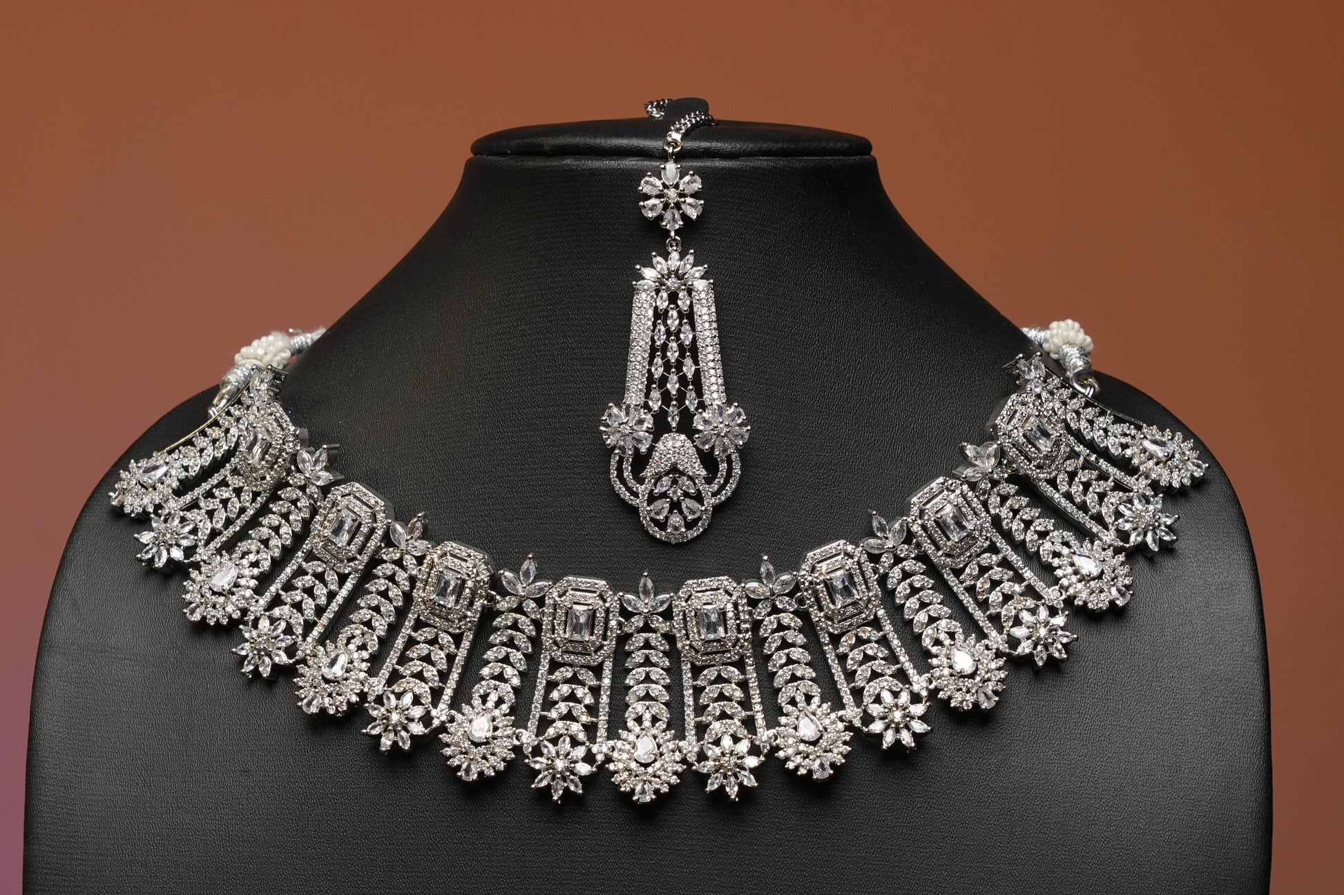 Enhance your look with our Cubic Zircon Necklace set. Made with high-quality zircon material, this set includes a necklace, earrings, and Mangtika. Perfect for both bridal and non-bridal occasions, add a touch of elegance to any outfit.