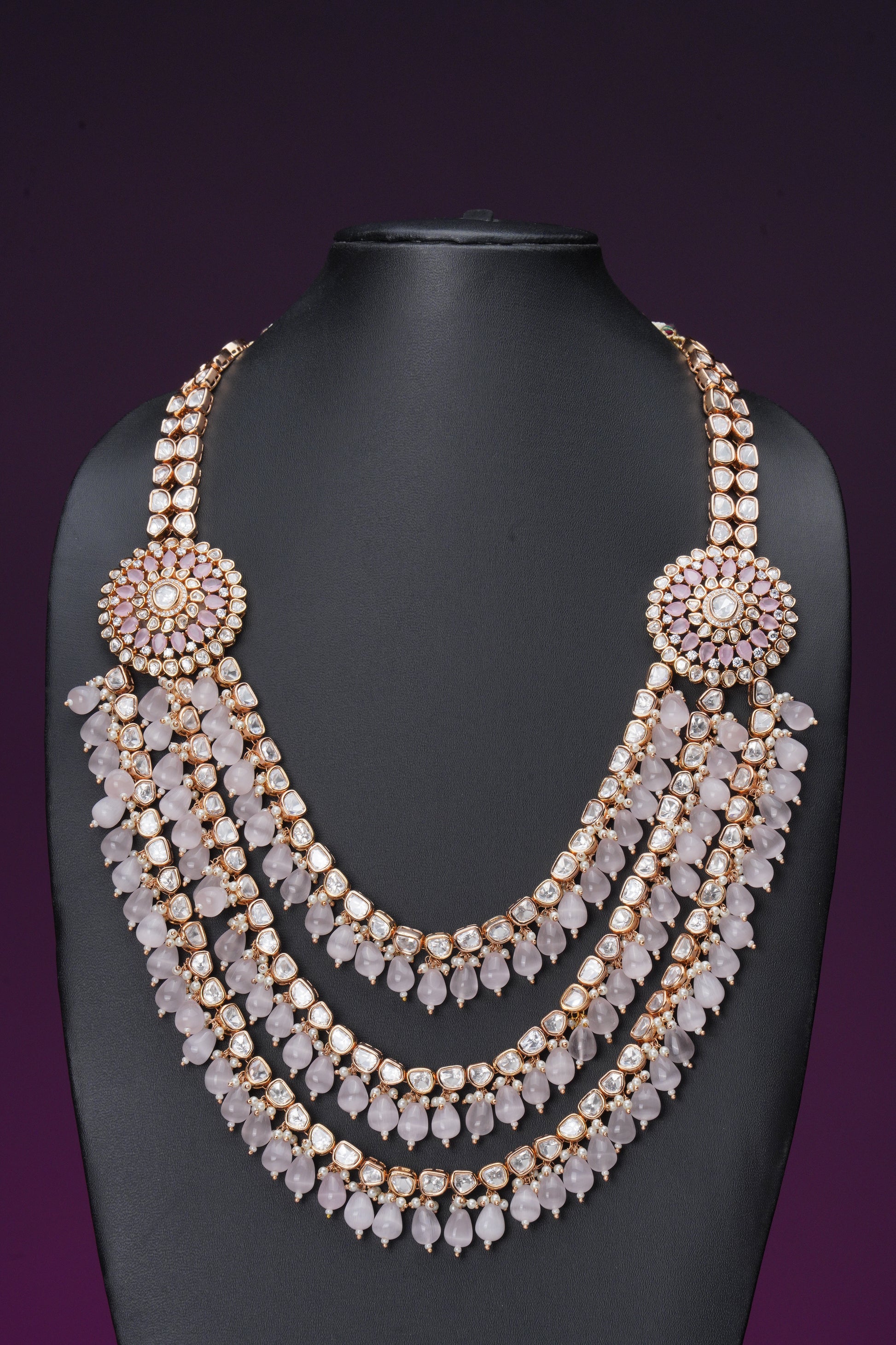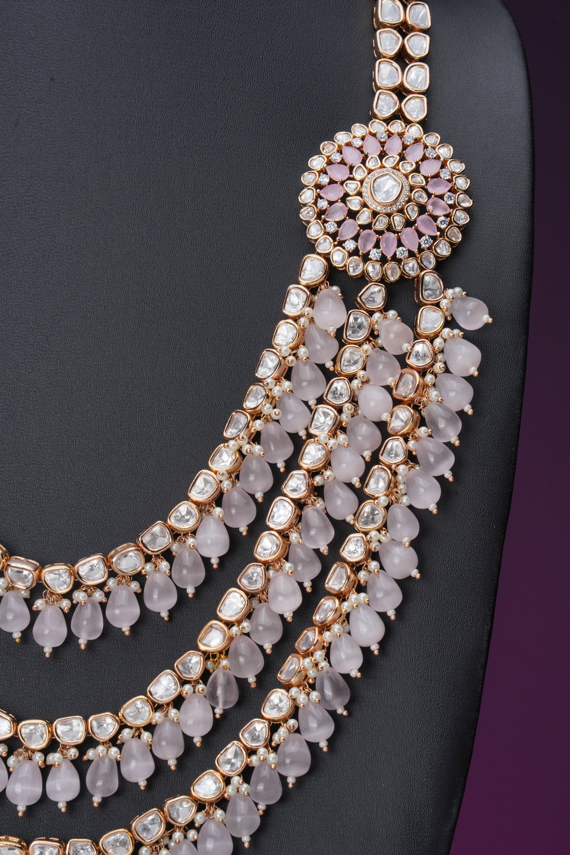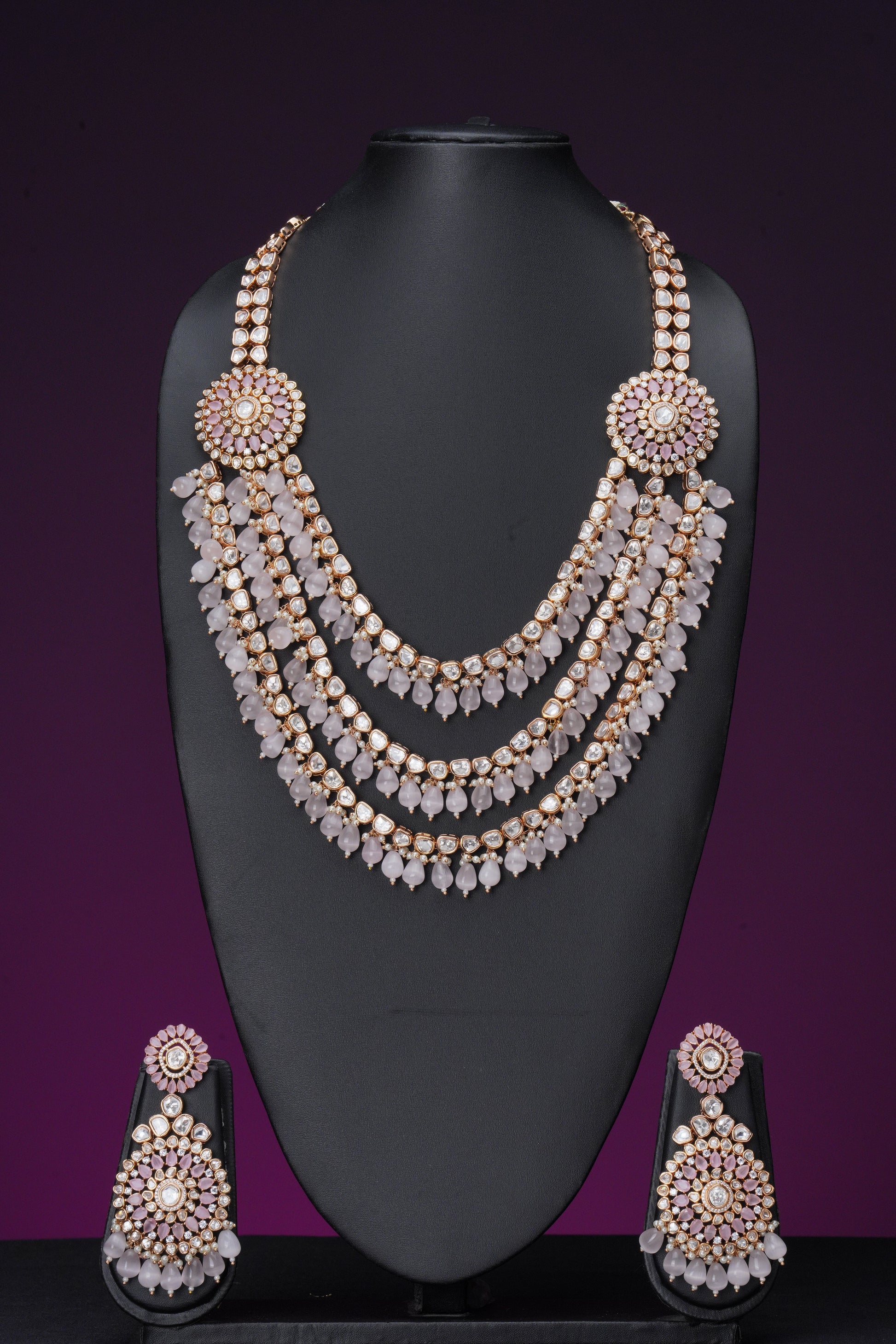 Expertly crafted with stunning Moissanite polki long chain, this necklace and earring set is the perfect non-bridal accessory. Add an elegant touch to any outfit with the added bonus of pearl hara adornments. Upgrade your style with this beautiful set.