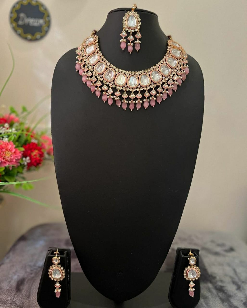 This exquisite Polki Kundan Necklace set features uncut Polki Kundan and delicate pink pearls. Perfect for both non-bridal and bridal occasions, this set includes a necklace, earrings, and mangtika. Elevate your ensemble with the timeless elegance of this set.