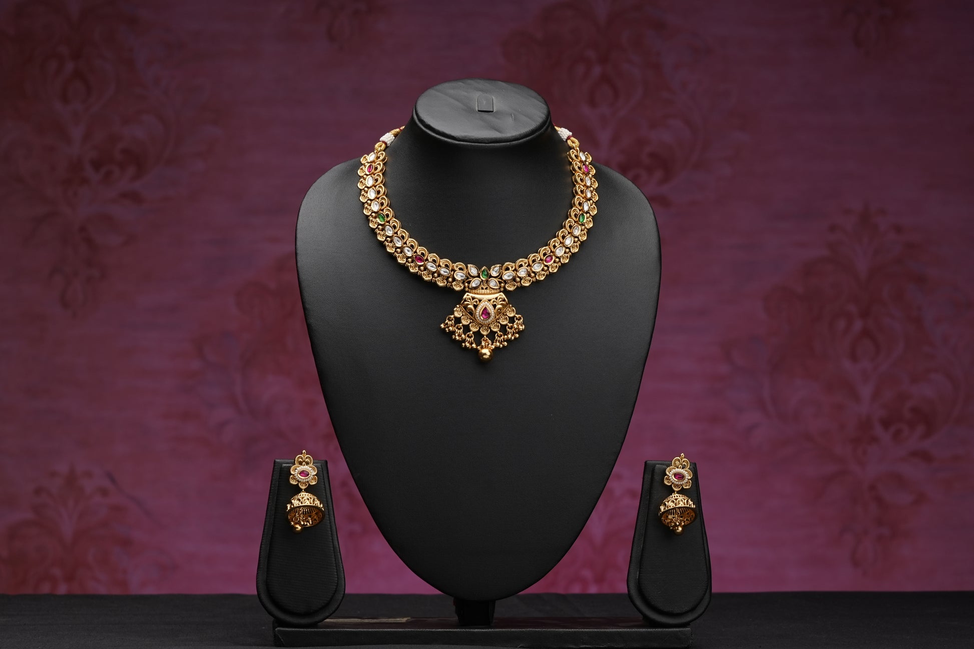 Elevate your style with our Traditional Kundan Short Necklace set. The stunning center piece, intricately designed with traditional Kundan, adds a touch of elegance to any outfit. Perfect for both bridal and non-bridal occasions, the short necklace and jhumka combination is a classic and timeless choice.