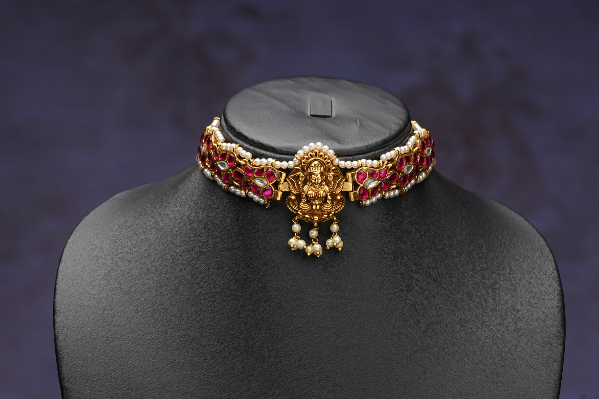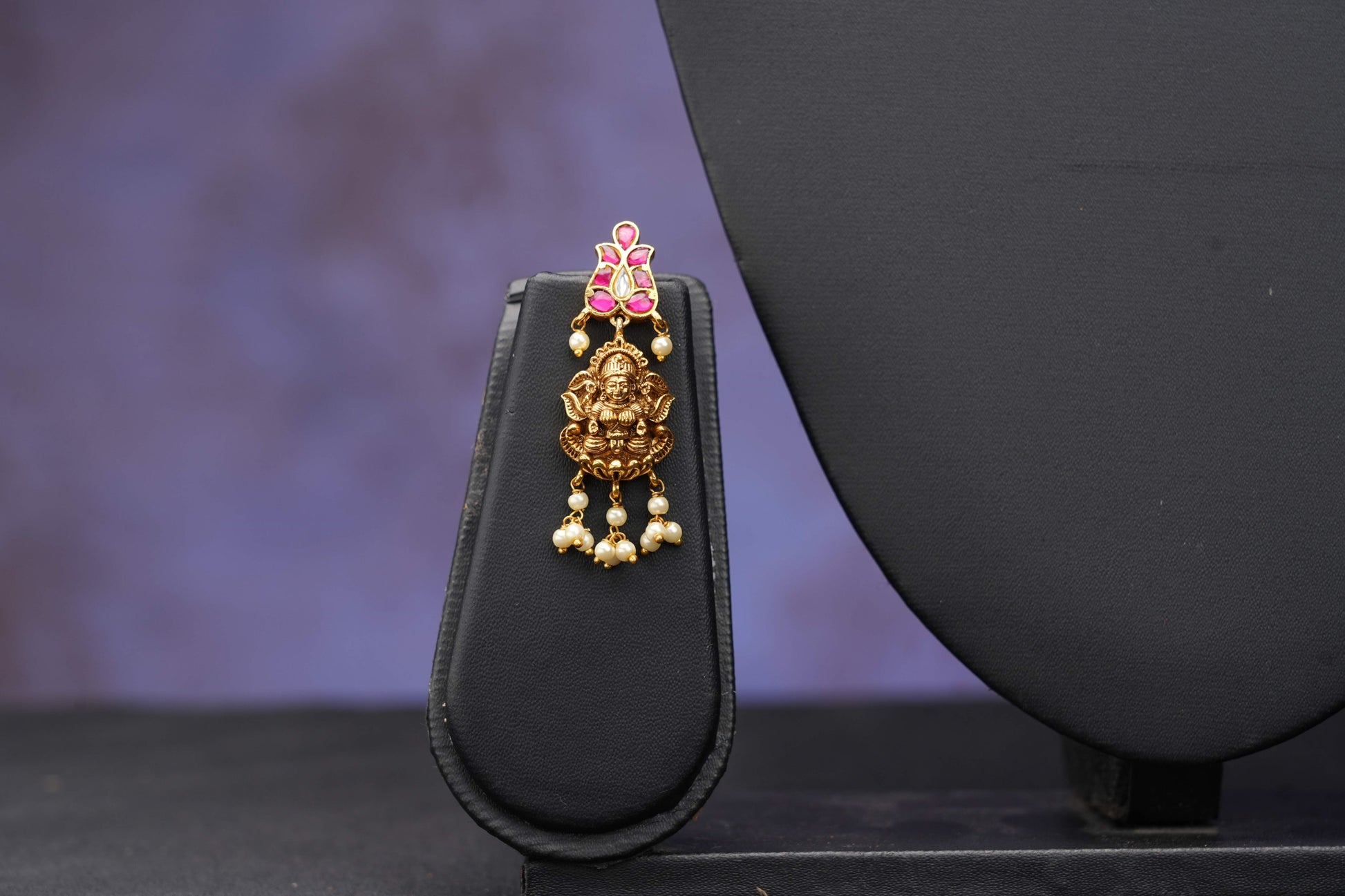 Elevate your style with the Temple Necklace set. This stunning set features a necklace and earrings adorned with white pearls and real Kemp stones. The center boasts a divine carving, adding a touch of elegance. Perfect for any occasion, this non-bridal set is a must-have for any fashion forward individual.