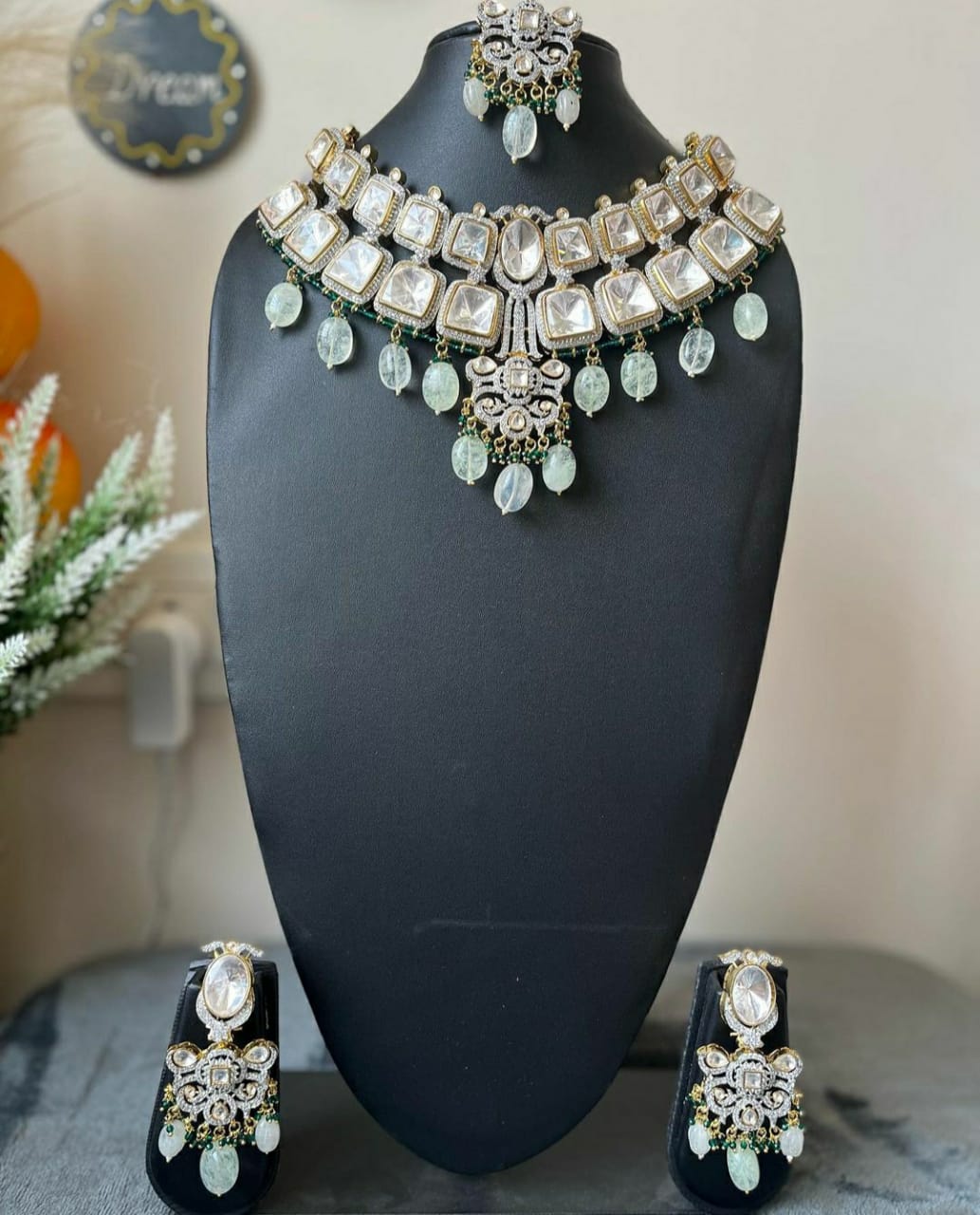 This polki set is a stunning handmade piece that offers both a necklace and earrings, along with a gorgeous mangtika. Featuring uncut polki stones and elegant green pearls, this designer set is perfect for both bridal and non-bridal occasions. Made with expertise and care, it is a beautiful addition to any jewelry collection.