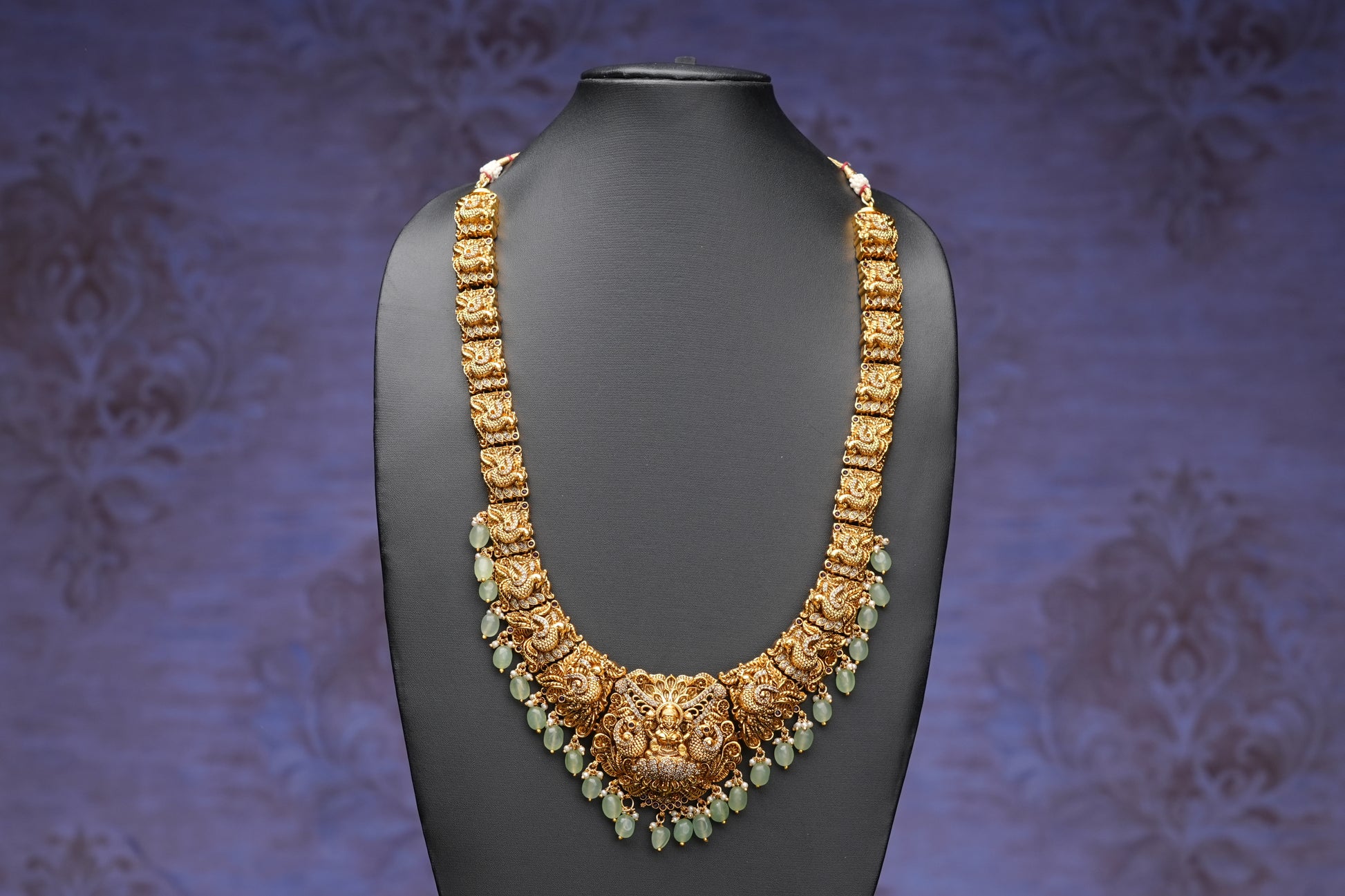 This elegant Antique Peacock themed Necklace features a stunning Goddess Lakshmi centerpiece, complemented by beautiful pastel beads. With its eye-catching peacock design, this necklace is suitable for both bridal and non-bridal occasions. Elevate any outfit with this exquisite antique piece.