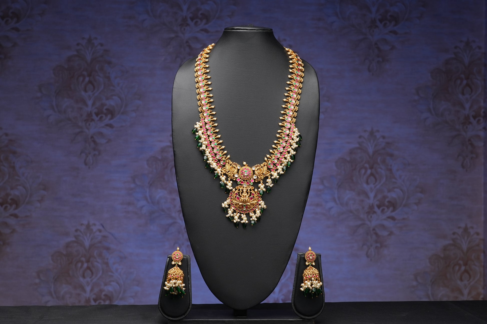 This stunning necklace set features a Goddess Lakshmi centerpiece surrounded by intricate jadau kundan work, accented with white and green pearls. The elegant peacock theme adds a touch of regality to this versatile piece, perfect for both bridal and non-bridal occasions. Expertly crafted for a timeless look.