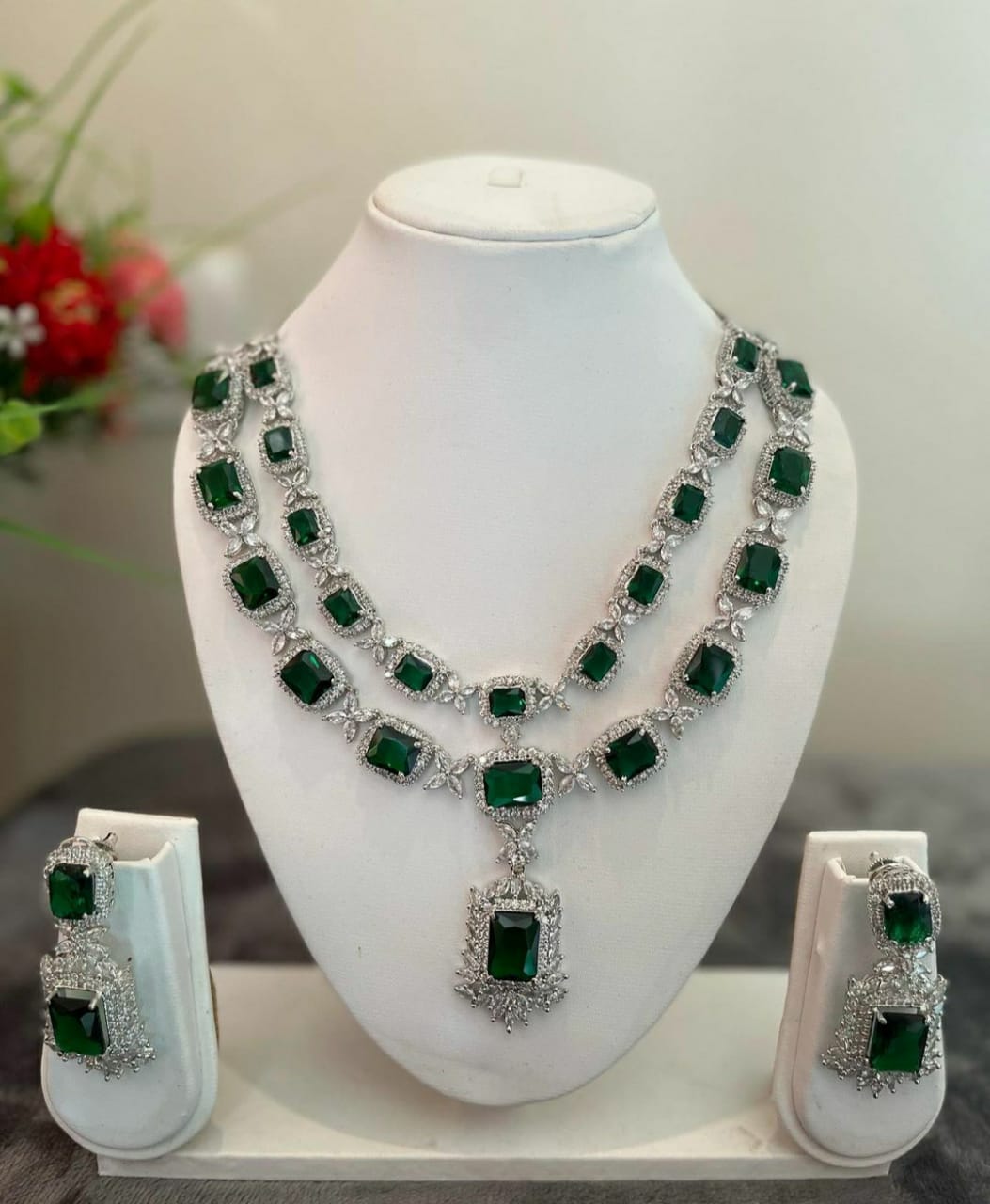 Discover elegance and luxury with the Emerald Diamante Necklace set. The stunning emerald diamonds and unique two layered design make this set a standout piece. Perfect for non-bridal occasions, add a touch of green to your outfit and turn heads. Includes matching earrings for a complete designer look.