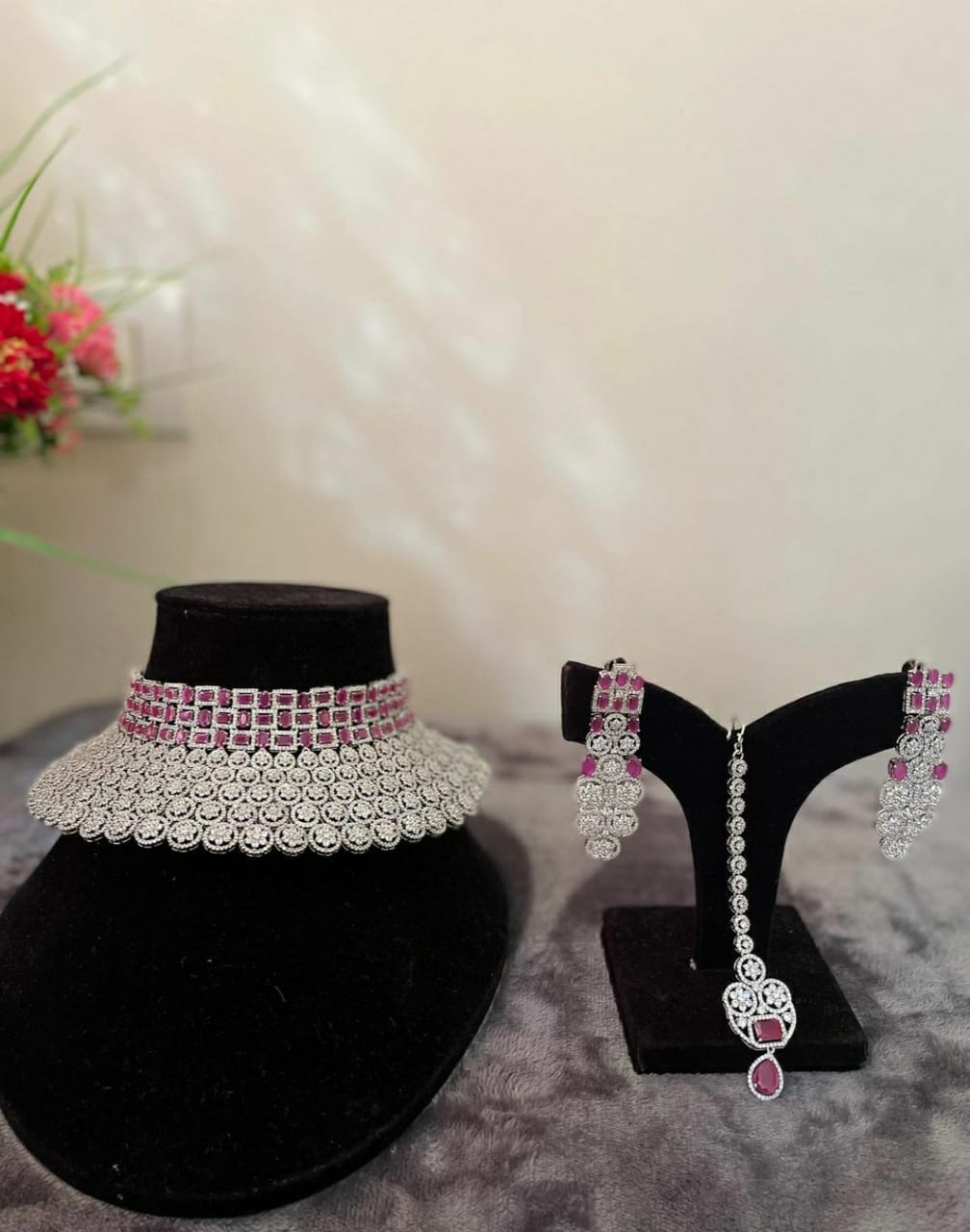 This Spectacular Diamante Choker set includes earrings and a mangtika, making it perfect for party-wear. The delicate carvings and stunning red and pink colors add to its non-bridal charm. Elevate your look with this beautiful set.