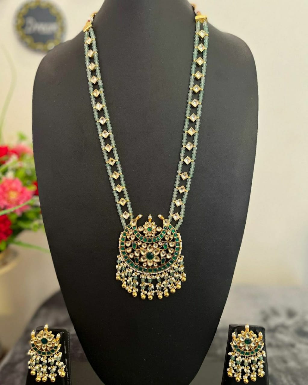 Elevate your bridal or non-bridal look with our Pachi Kundan Long chain set. The traditional Pachi Kundan design is complemented by delicate pearls and vibrant green color. This set includes a stunning long chain necklace and matching earrings, perfect for any occasion.