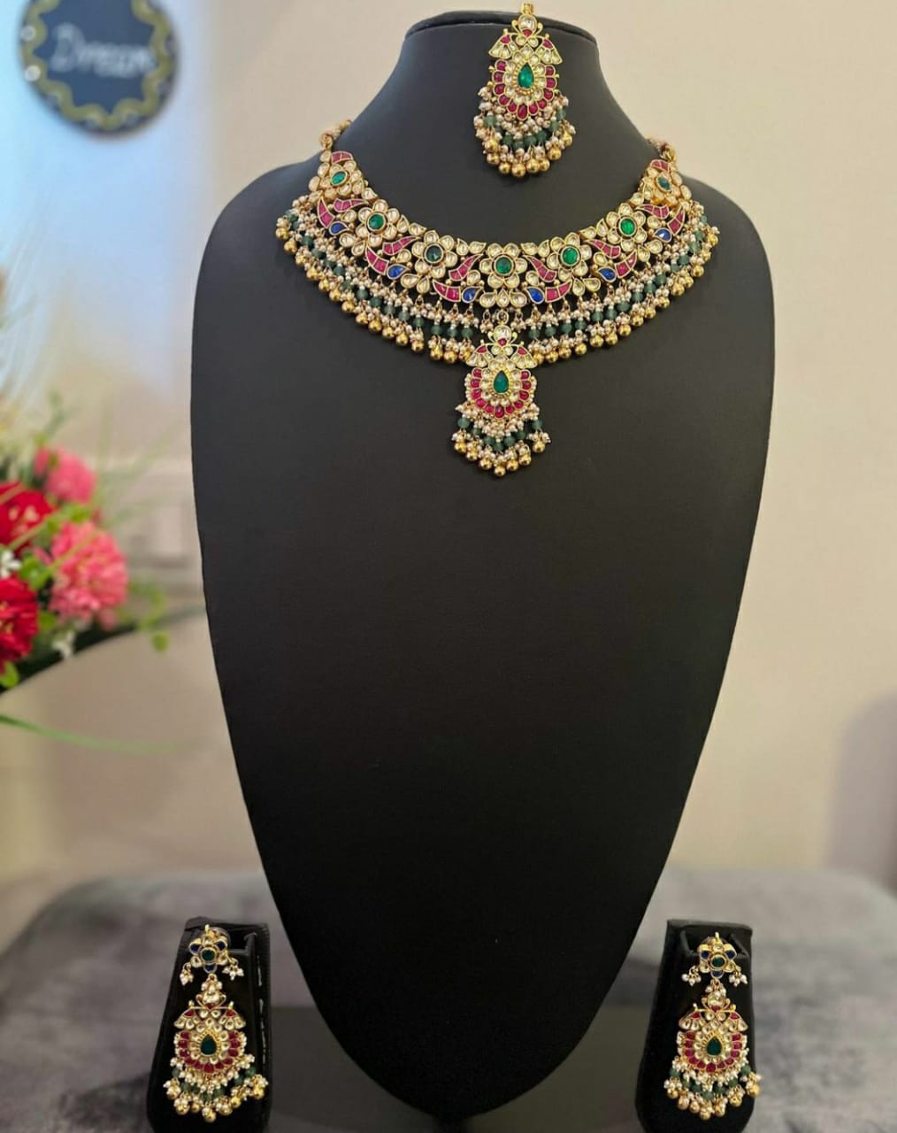Expertly crafted with traditional techniques, the necklace set features stunning jadau pachi kundan in vibrant red and green hues. Designed for the modern bride, this luxurious set includes a necklace, earrings, and mangtika with intricate details. Elevate your bridal look with this handcrafted masterpiece.