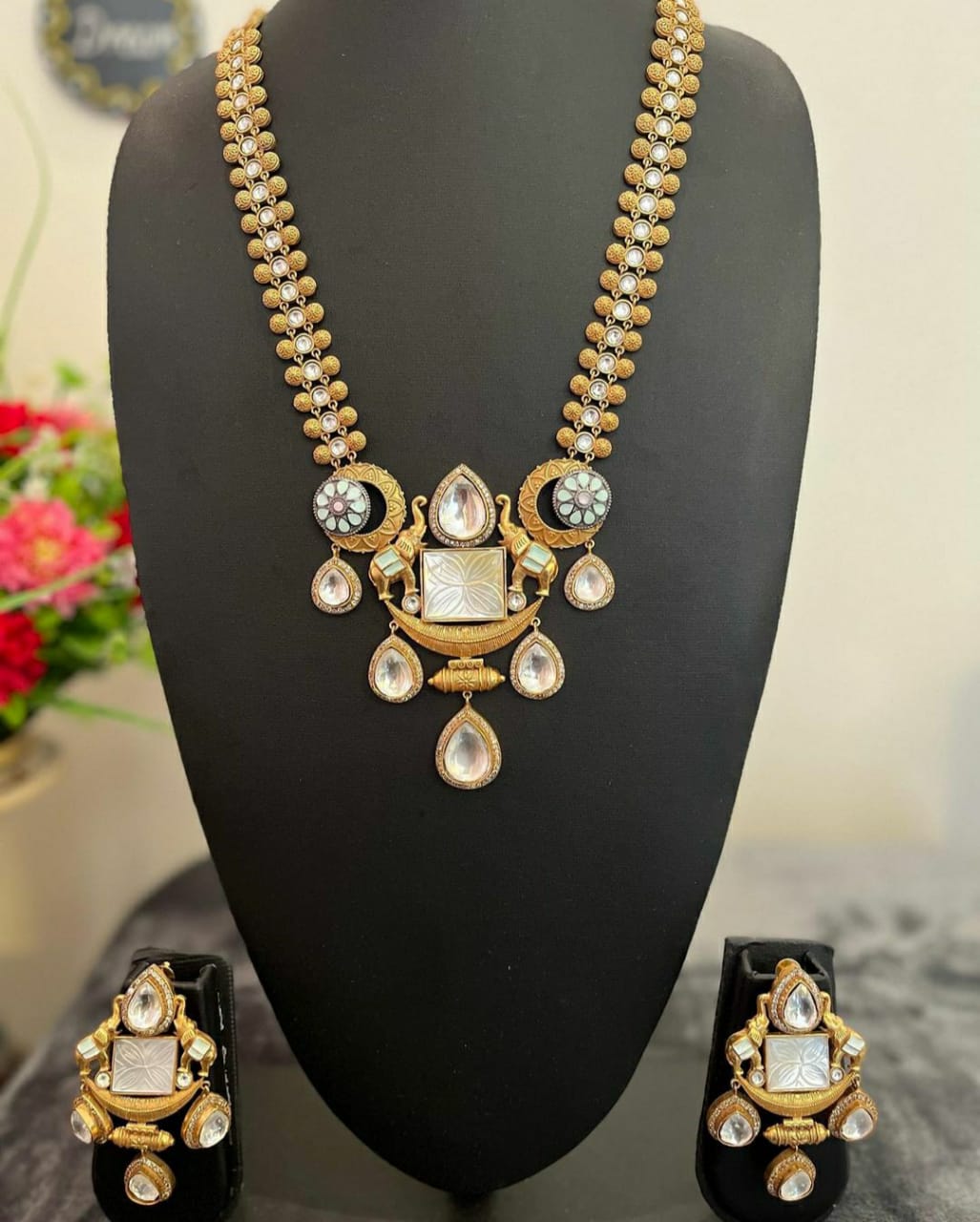 Elevate your bridal look with our Rajwaadi fusion necklace set. This set features a single layer of intricate designs, perfect for adding a touch of elegance to any outfit. The fusion of Rajwaadi and Moissanite polki creates a stunning combination, making it the perfect addition to your jewelry collection.