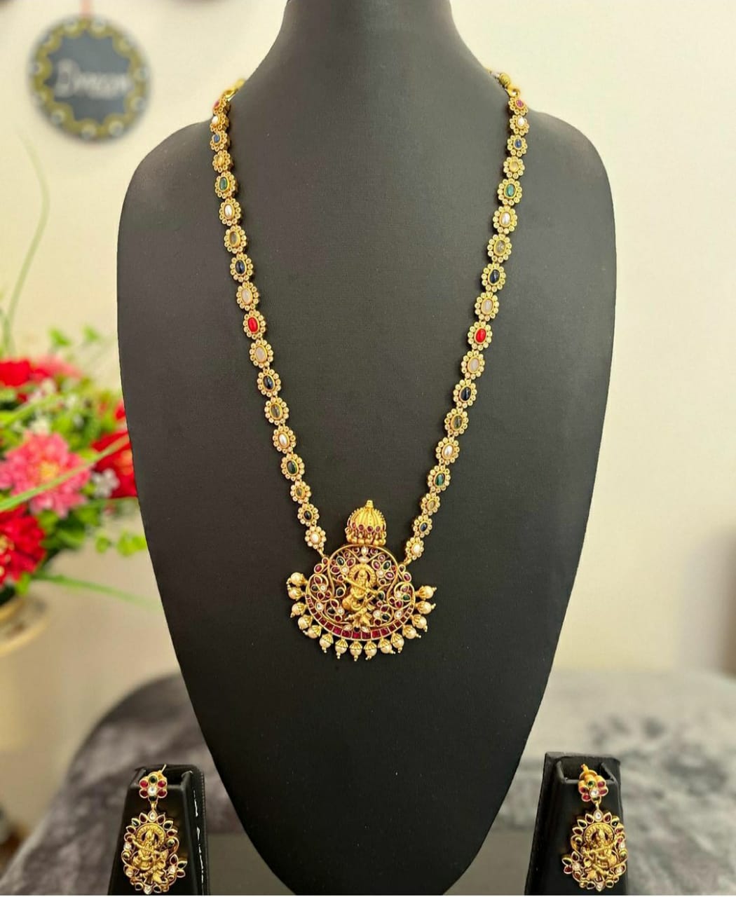 This traditional temple set exudes elegance with its intricate design of Lord Krishna carving on the center piece. Adorned with Navarathna stones, this set is perfect for any bridal occasion. The long chain and earrings add a touch of sophistication, making it a must-have for any temple jewelry collection.