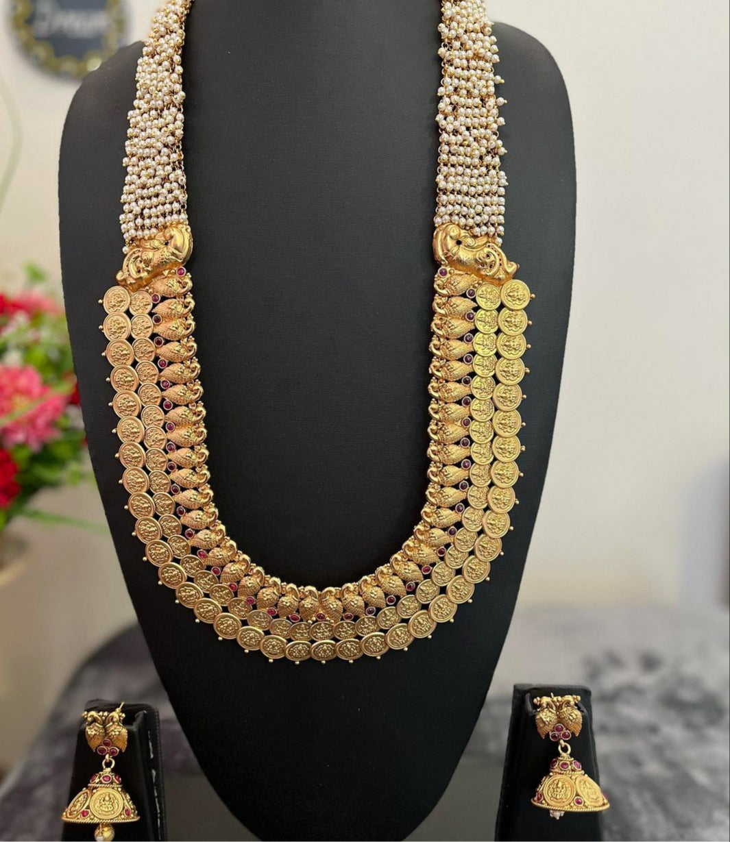 Elevate your bridal look with the traditional and elegant Kasina Hara necklace. Featuring a long chain adorned with beautiful pearls and a classic jhumka, this temple-piece will add a touch of timeless charm to any outfit. Expertly crafted for the perfect bridal statement.