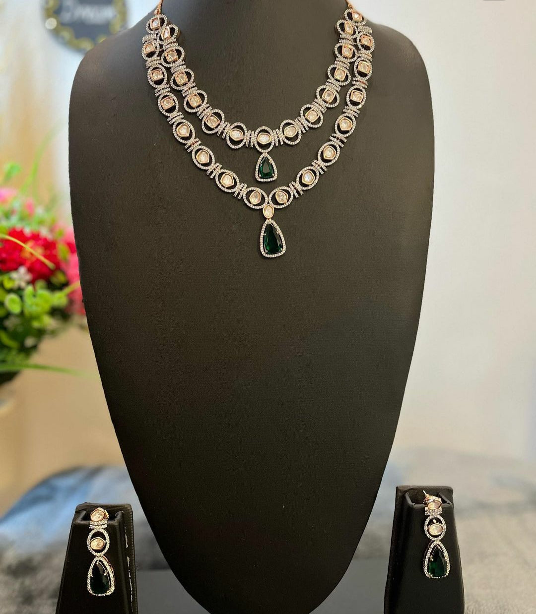 Expertly crafted with a stunning 2-layered design, this Moissanite necklace set showcases a bold green stone for a unique touch. Perfect for any occasion, this non-bridal set exudes elegance and sophistication. Made with expert precision, it's a timeless addition to any jewelry collection.