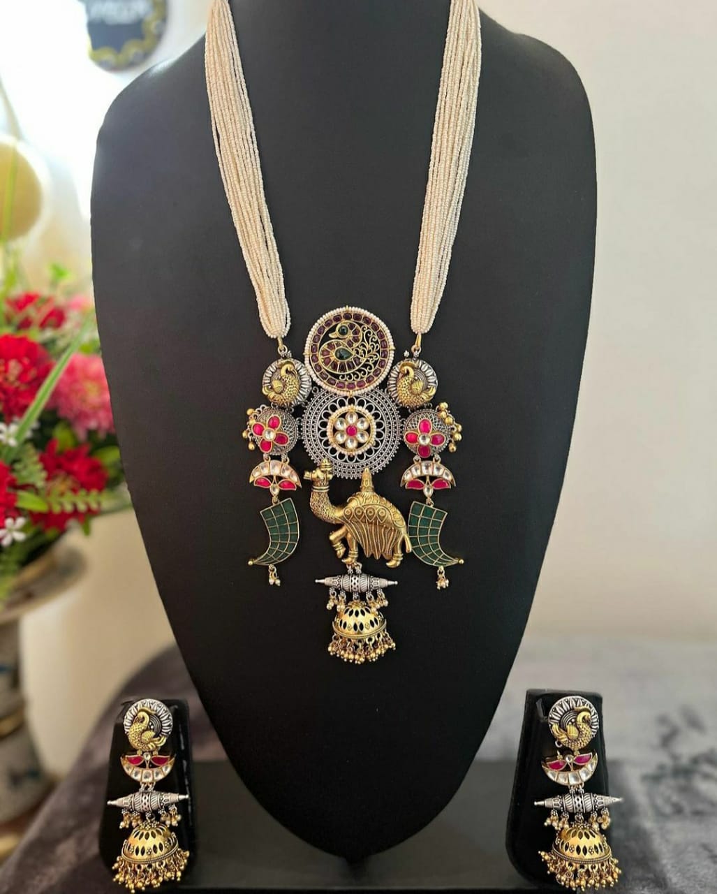 Elevate your bridal or non-bridal look with Pearl Fusion long chain set. The fusion of white pearls and Kundan details give this silver look alike set a sophisticated touch. The intricate center piece design adds an elegant focal point. Perfect for any occasion.