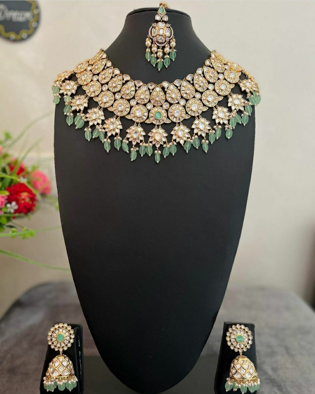 Expertly crafted with high quality, uncut polki, this choker set is perfect for bridal wear. The set includes a choker, earrings, and mangtika, all adorned with beautiful turquoise pearls. Elevate any look with the timeless beauty of this exquisite piece.