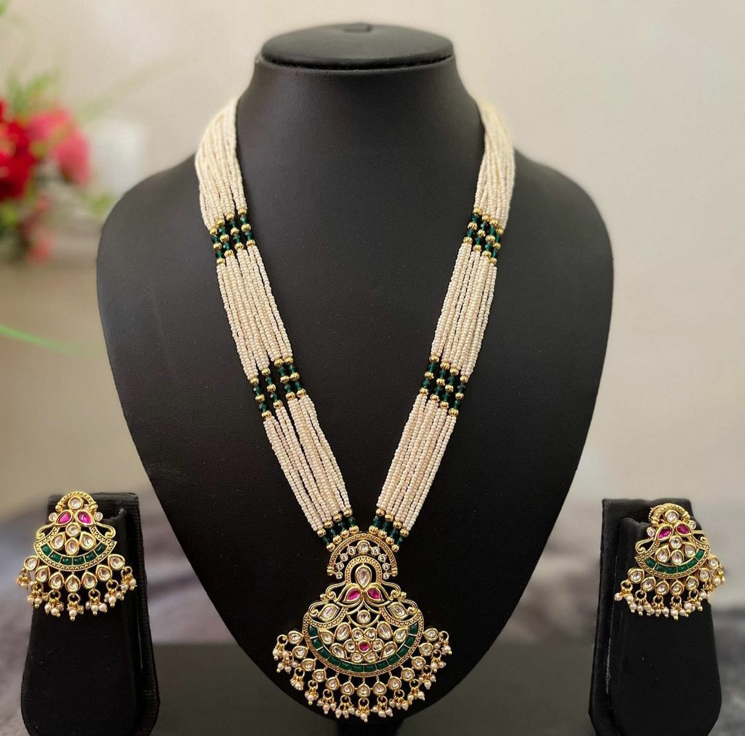 Expertly crafted for beautiful brides, the set features shimmering Moissanite polki stones, elegant white pearls, and a long chain for a stunning and sophisticated look. Complete your bridal ensemble with the included earrings and the beautifully crafted center piece.