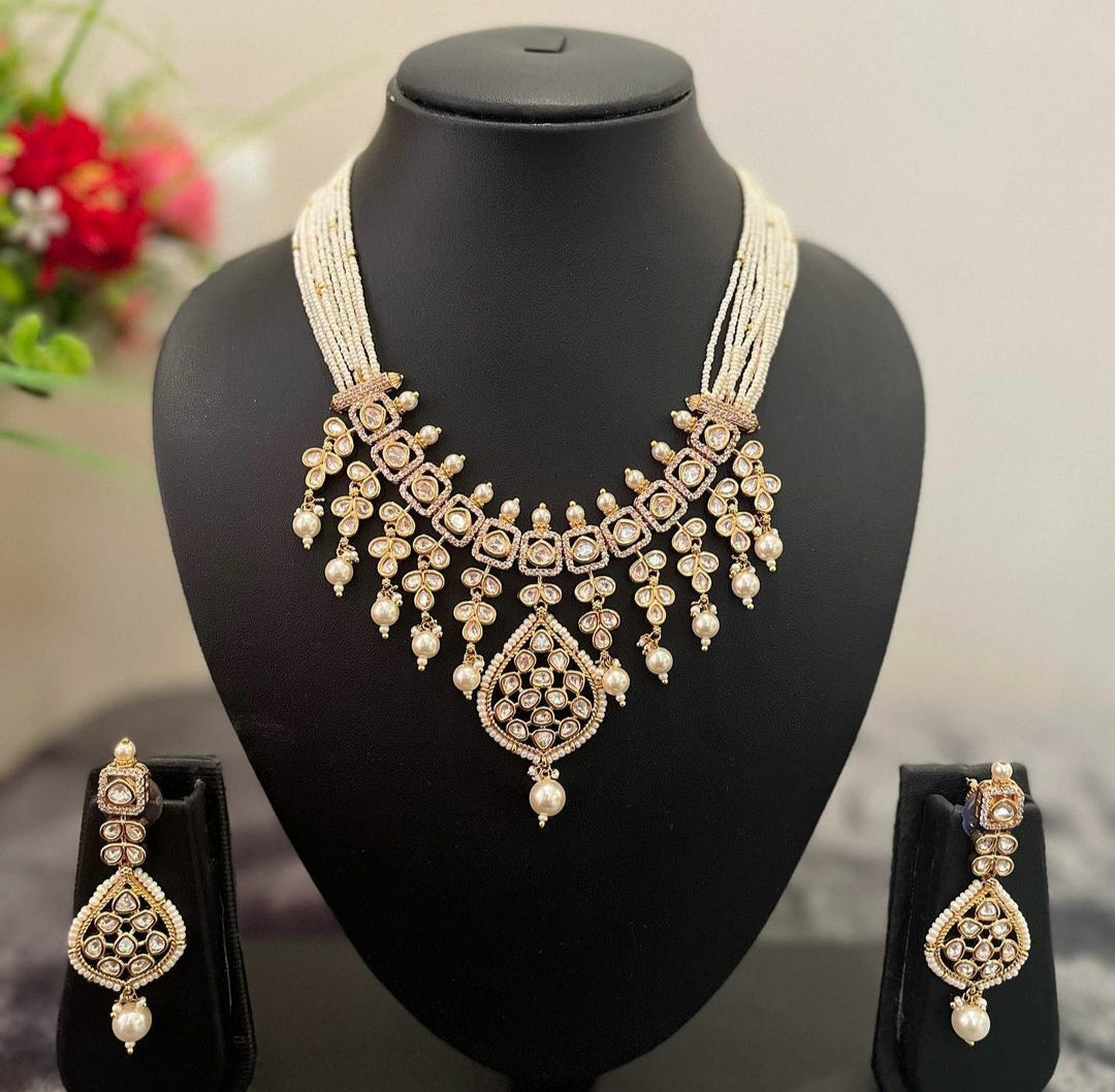 Expertly crafted for the modern bride, the Moissanite polki with pearls hara set showcases the perfect combination of elegance and sophistication. Featuring beautiful Moissanite polki and white pearls, this set is the ideal choice for those looking for a timeless yet unique design. Complete your bridal look with the Mid-chain and matching earrings.