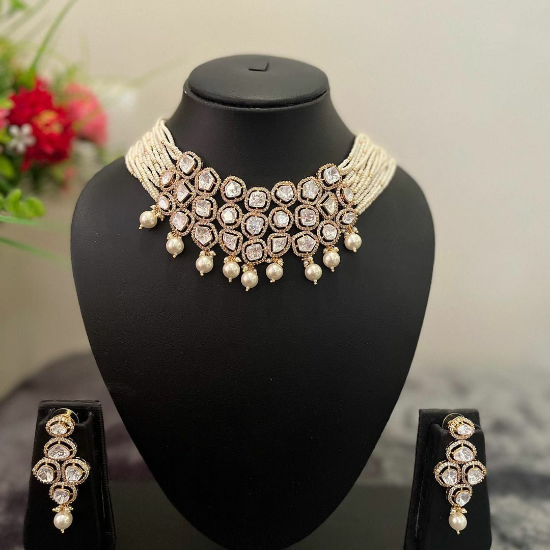 Expertly handcrafted with dazzling Moissanite Polki and white pearls, this 3-layered necklace set exudes class and elegance. Perfect for non-bridal occasions, this handmade set will make you stand out with its unique and stunning design. Upgrade your jewelry collection with the necklace set.