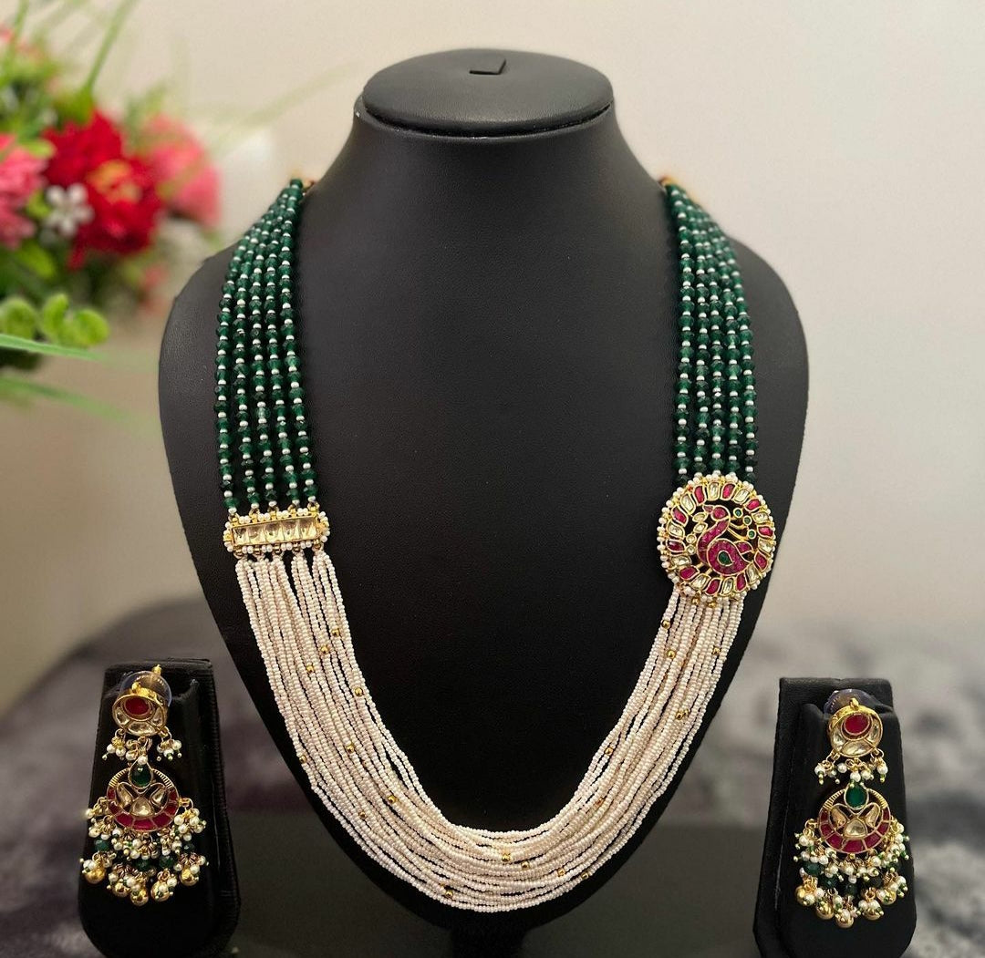 Elevate your style with our Pachi Kundan hara, adorned with elegant pearls. Perfect for both men and women, this long hara is a stunning addition to any outfit. Complete your look with the accompanying earrings. Ideal for bridal wear, its simple yet sophisticated design exudes timeless charm.
