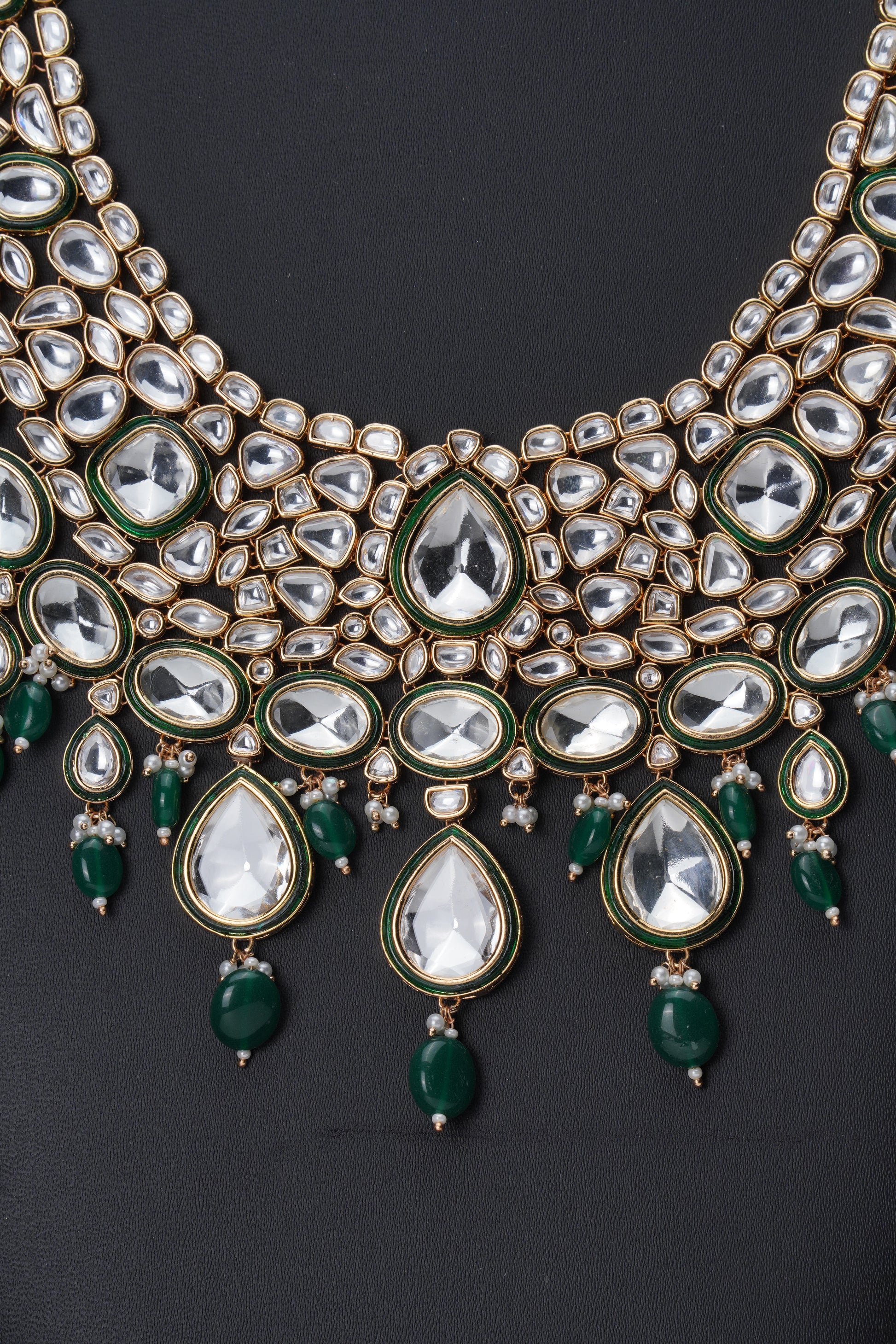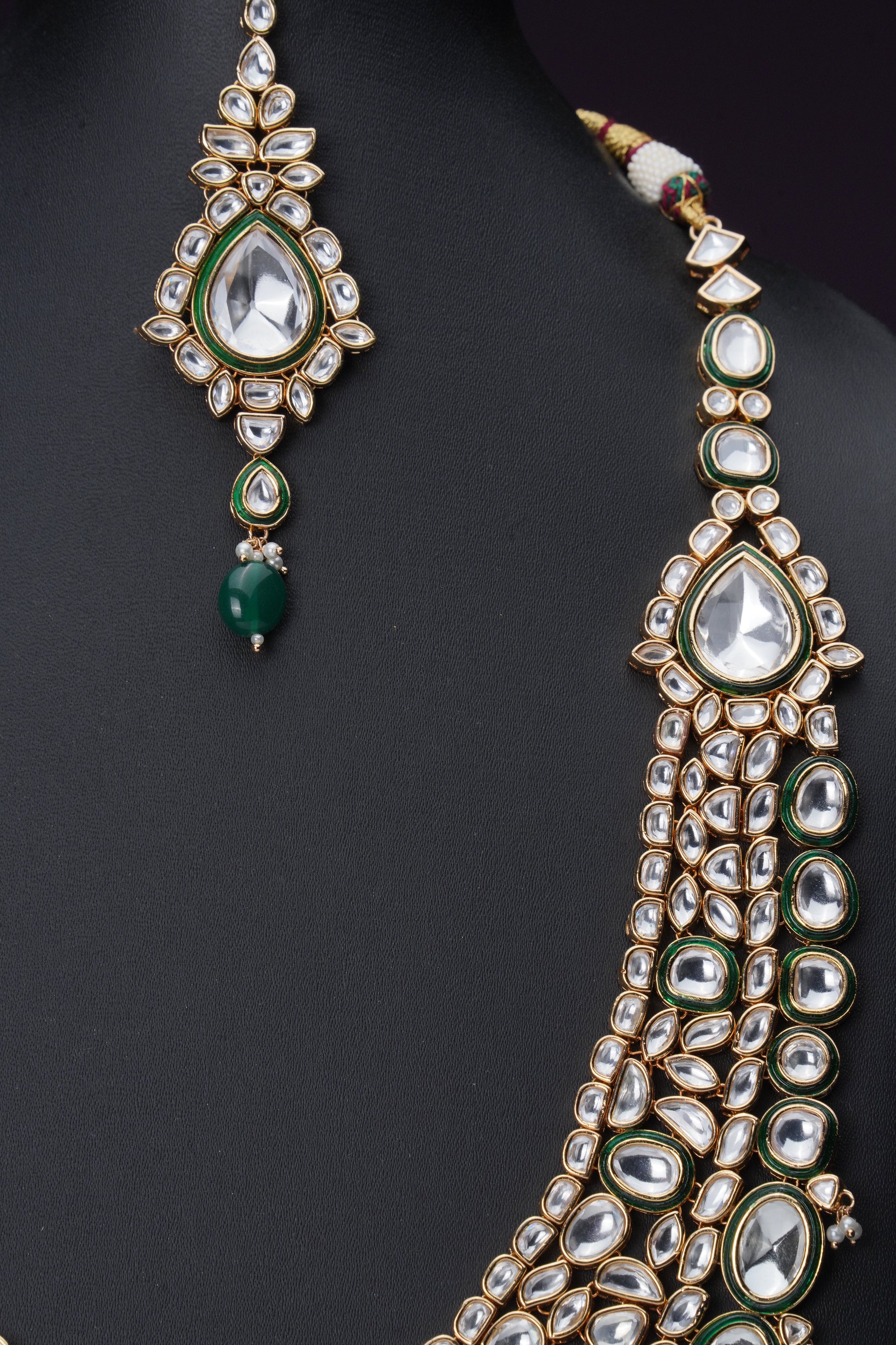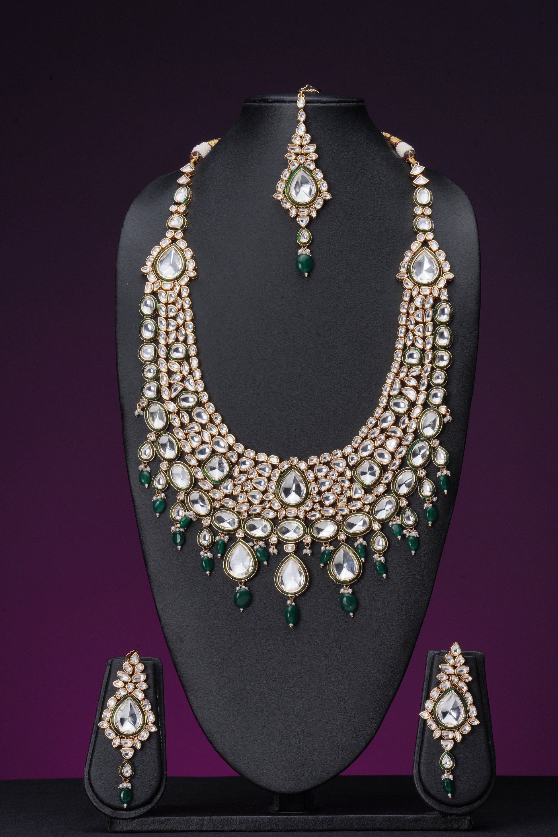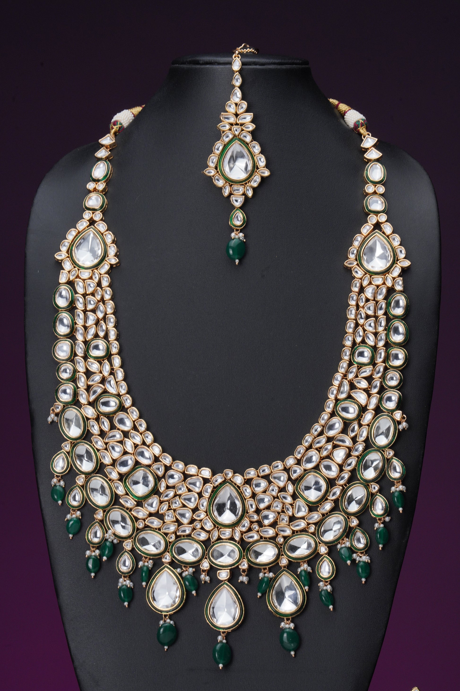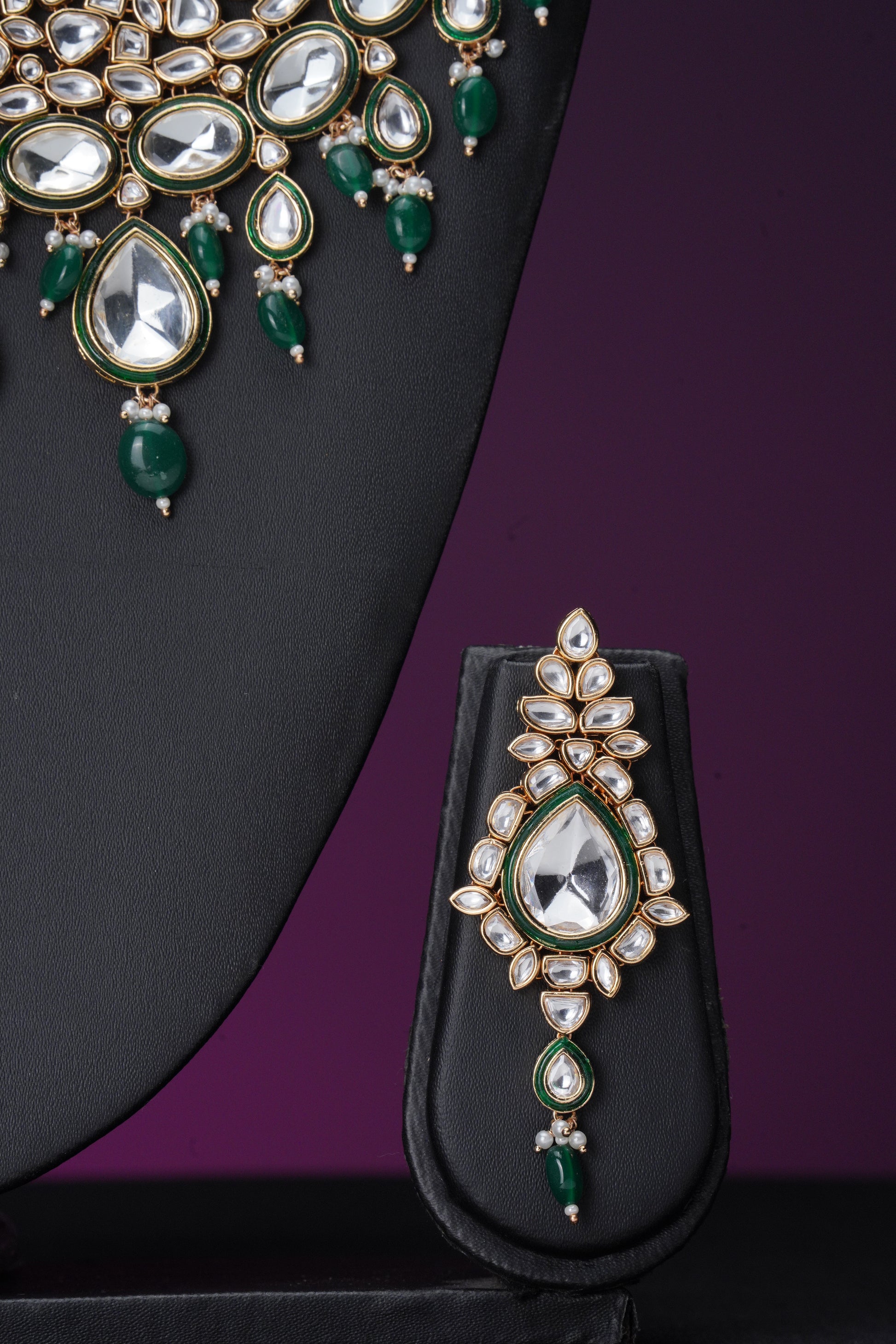 This handcrafted Kundan necklace set (Green) features exquisite green pearls and a heavy jewel design. Perfect for bridal wear, this set also includes earrings and a mangtika. Elevate your look with this stunning and unique piece.