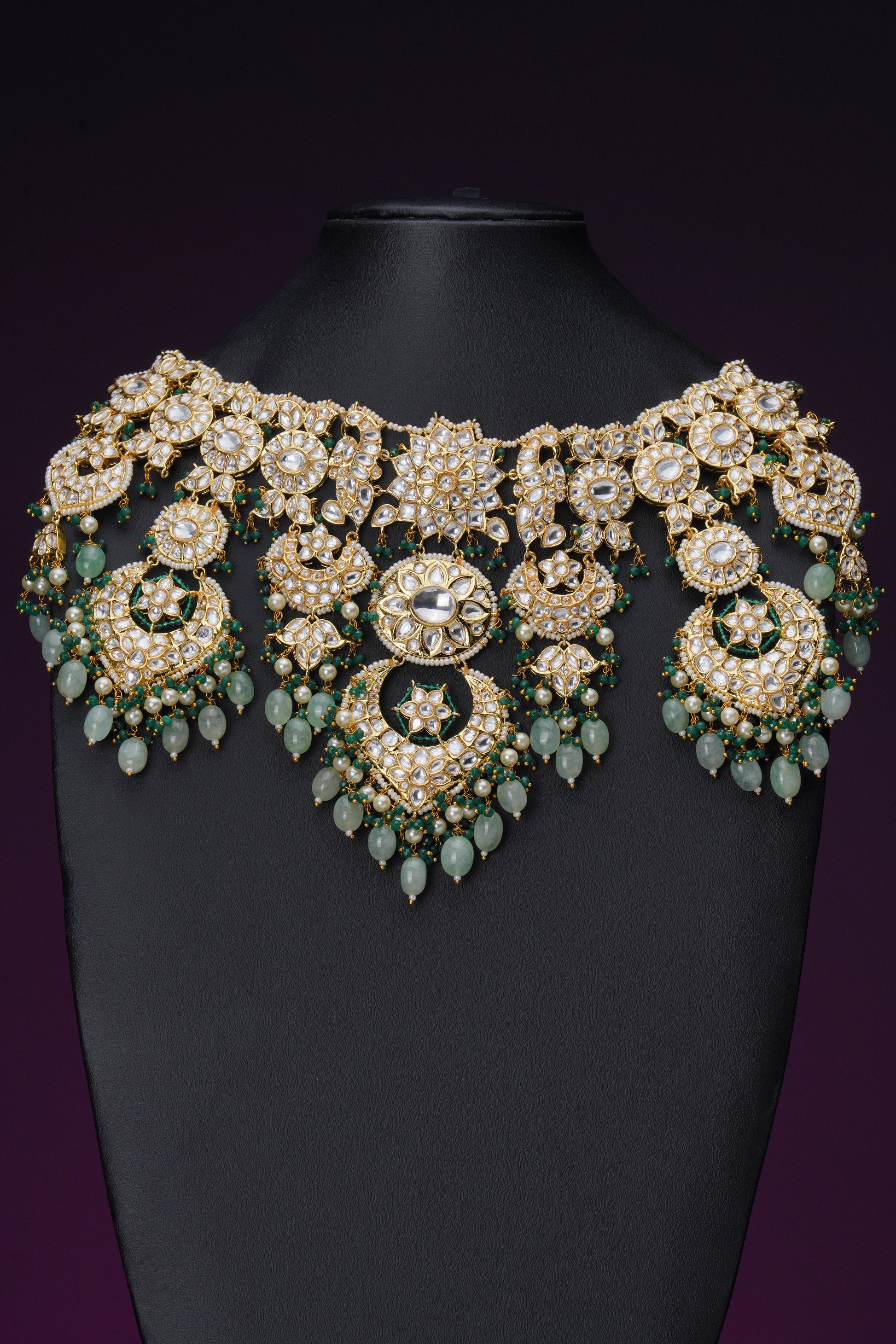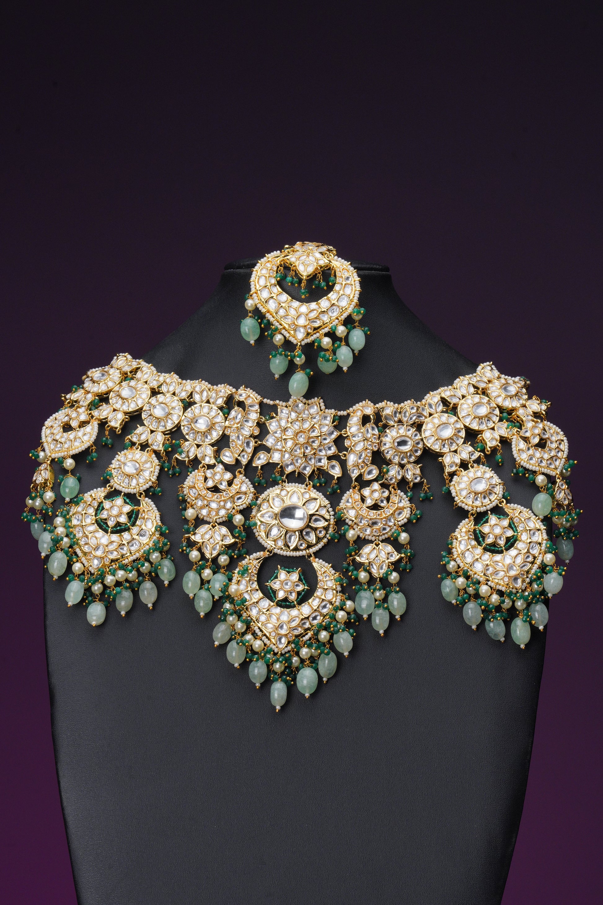 This non-bridal uncut Polki Kundan choker set boasts a high quality, intricate design with matching earrings and mangtika. Elevate your wardrobe with traditional elegance and timeless style.
