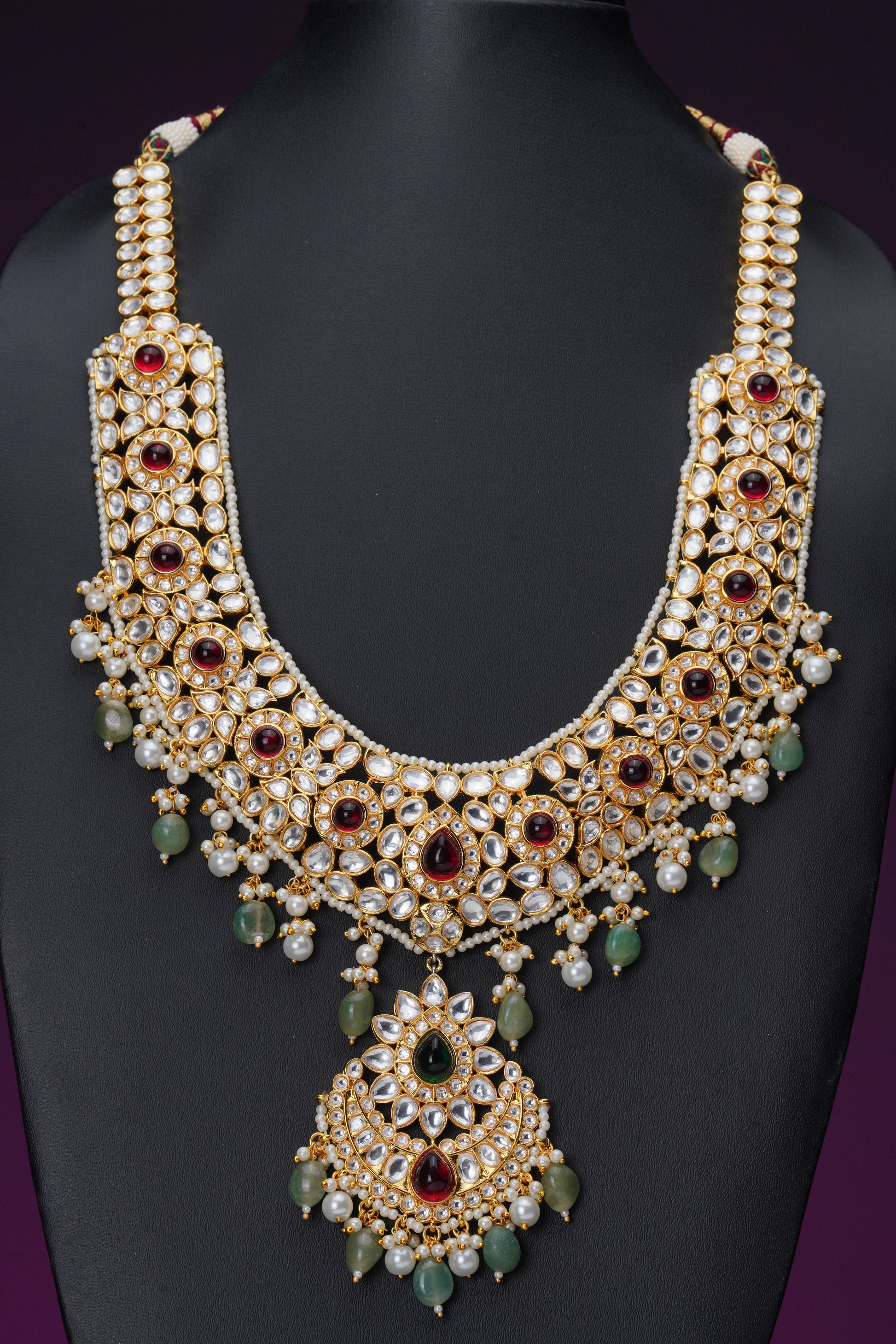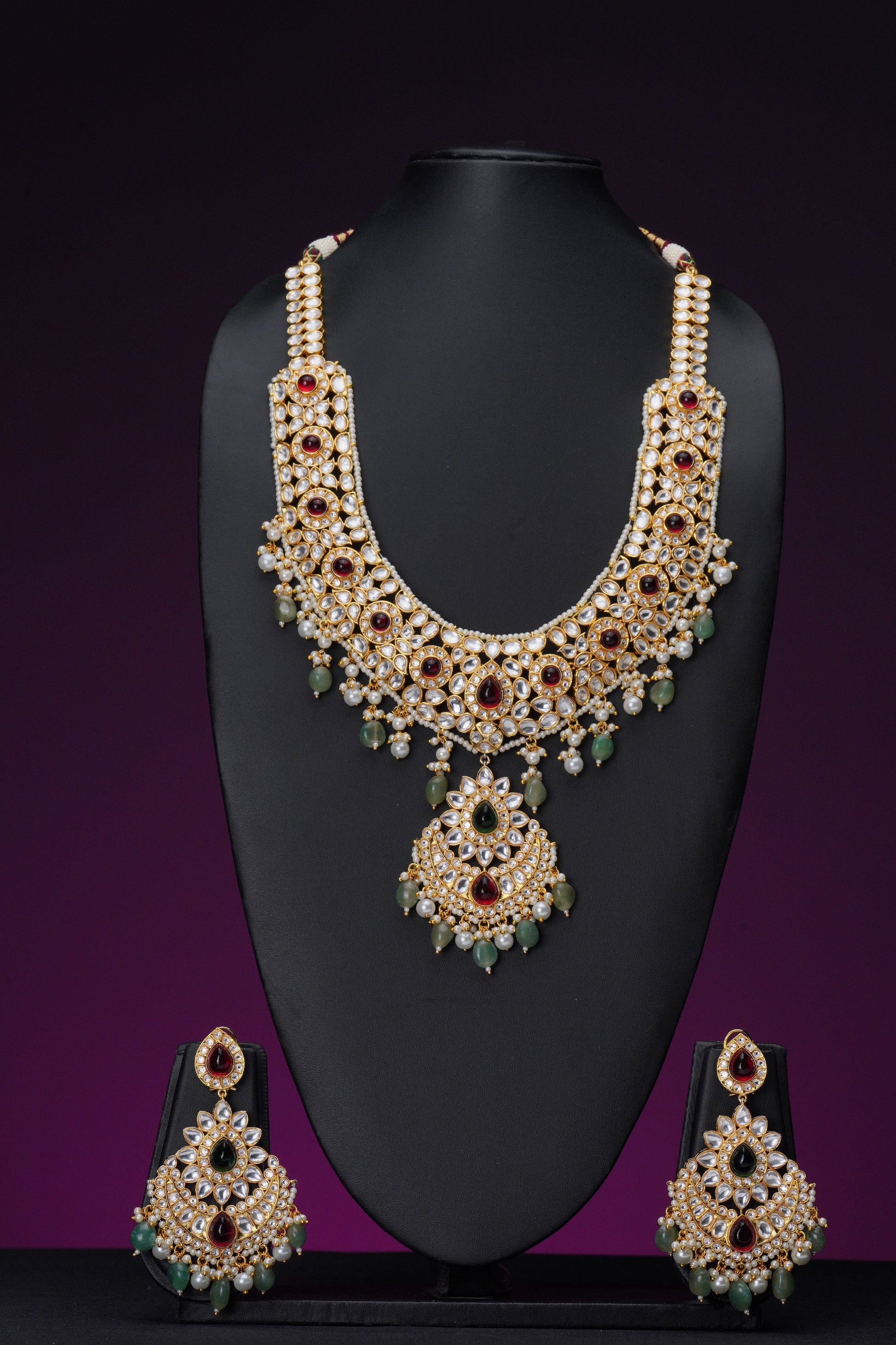Add a touch of elegance to your bridal look with our Fresh water pearl set. Handcrafted with kundan accents and lustrous fresh water pearls, this red colored set exudes beauty and sophistication. Perfect for brides looking to make a statement on their special day.