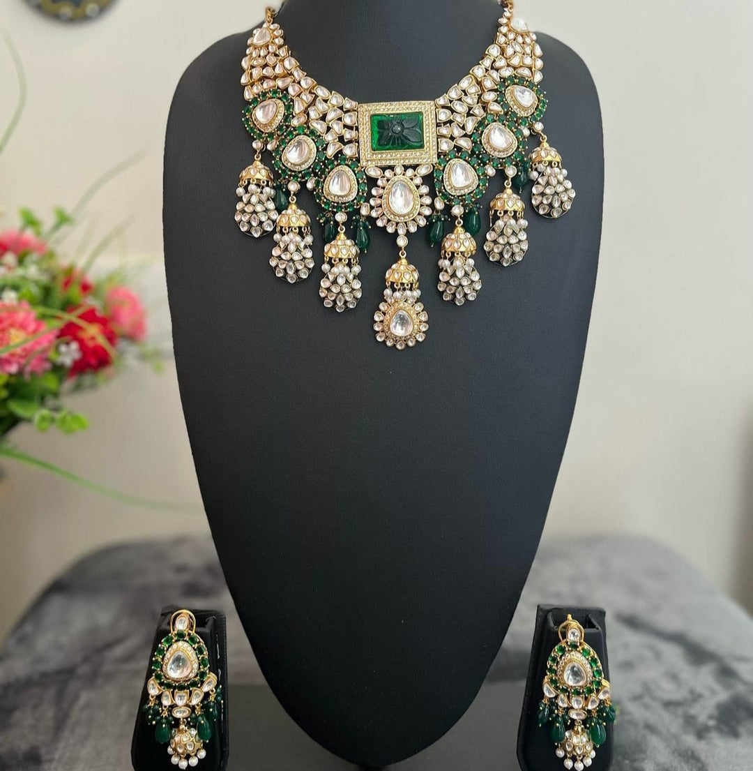 Introducing NJNS110, a stunning choker set adorned with moissanite polki and green carving stone. This versatile set is perfect for bridal wear and adds a touch of class to any outfit. Elevate your style with the brilliance and elegance of this unique design.