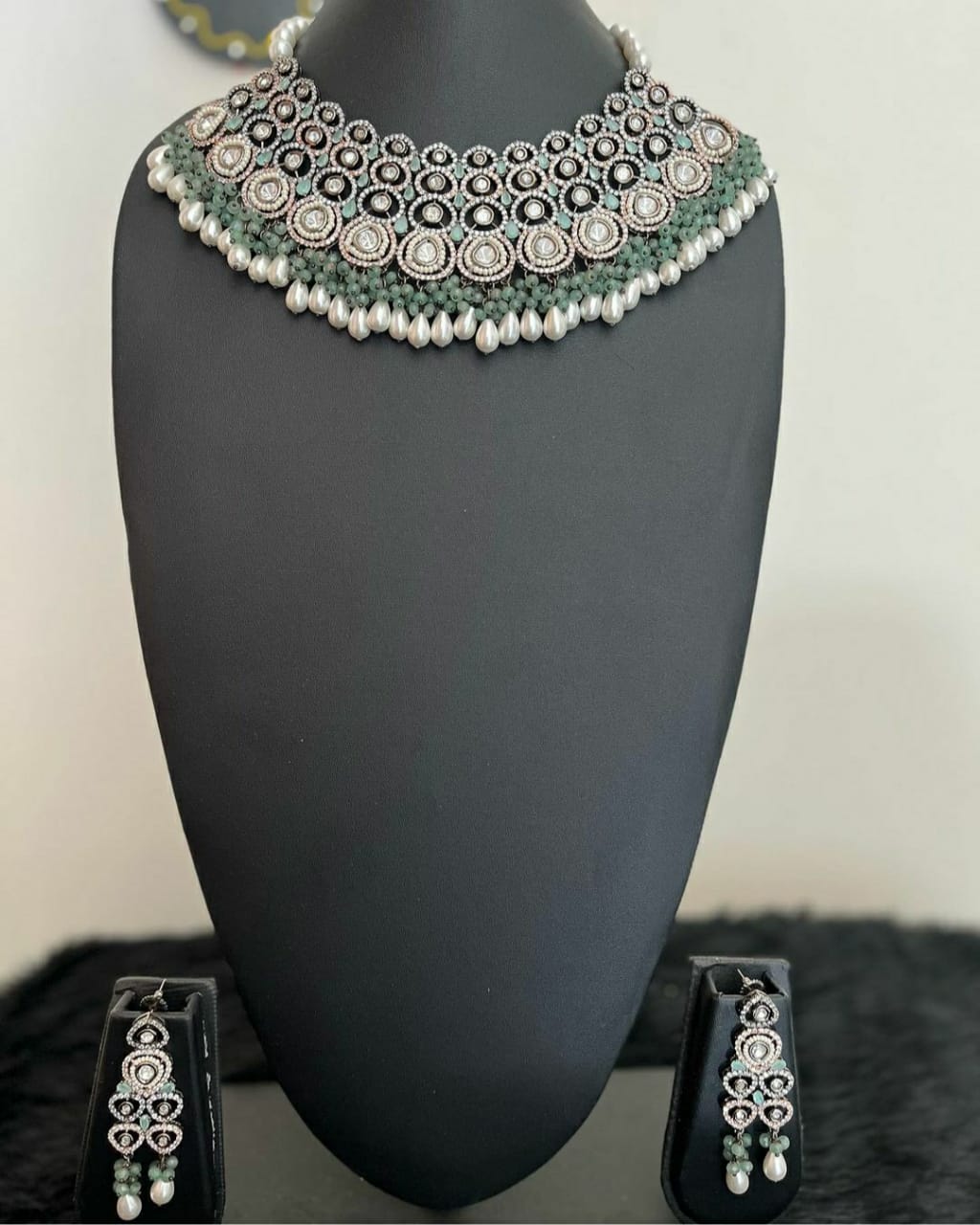 "Add a touch of elegance to your wardrobe with the NJNS103 Moissanite polki designer necklace set. The stunning combination of green and white pearls with Moissanite polki adds a unique sparkle to this traditional design. Complete your look with the included earrings for a truly timeless and sophisticated ensemble."