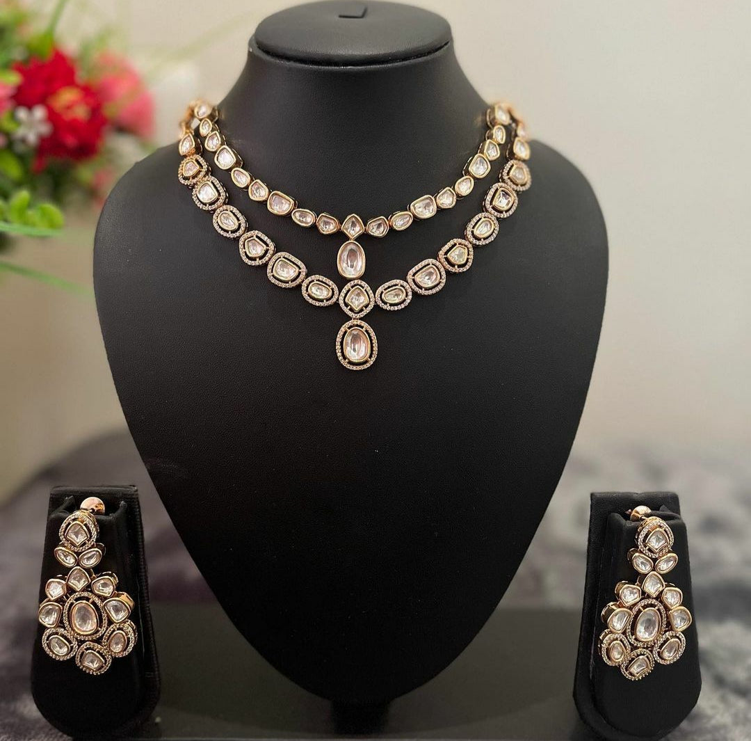 Expertly crafted with genuine polki stones, this necklace set features a double liner design for a stunning and unique look. Perfect for non-bridal occasions, this set includes both the necklace and earrings for a complete and elegant ensemble. Elevate any outfit with the beauty and sophistication of the Polki necklace set.
