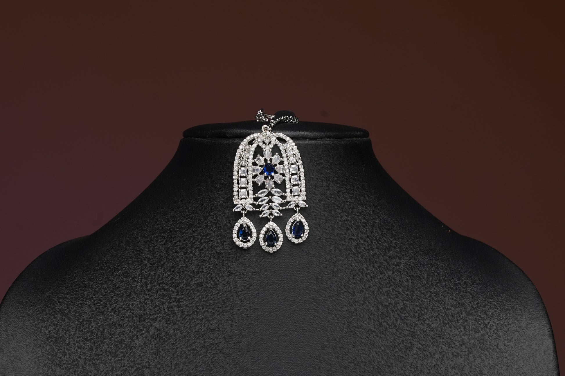 This two layer Sapphire diamante necklace boasts a stunningly elegant design and includes matching earrings. Perfect for both bridal and non-bridal occasions, it adds a touch of sophistication to any outfit. With its sparkling gemstones and unique layered style, this necklace is a must-have for any jewelry collection.